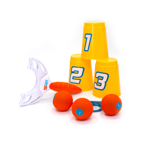 Stack and arrange the 3 target cups anyway you'd like to prove your accuracy skills. Fire the Djubi balls to knock'em down one at at a time... or all at once! The Spring Shot was designed to make launching easy, and makes it fun to improve accuracy!