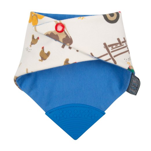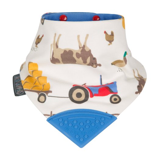 Simple Classic - Stylish grey with baby blue reverse and attached baby blue teether. Introducing the Neckerchew - the award-winning chewy dribble bib for teething. The unique design combines the popular dribble bib concept with an attached chewy teether. This prevents the problem of babies dropping teethers on dirty floors or losing them when out and about. Available in a variety of different colours and designs, each Neckerchew is fully reversible. The bibs are made from super soft jersey cotton and have an absorbent middle layer to lock in moisture away from small chests. The textured triangle gives great bite. The teether contains no phthalates or BPA, will never flake or peel and is 100% safe for babies to chew on. Secured with a double popper fastener, the Neckerchew can expand to grow with your baby. Machine washable at 40 degrees Celsius.