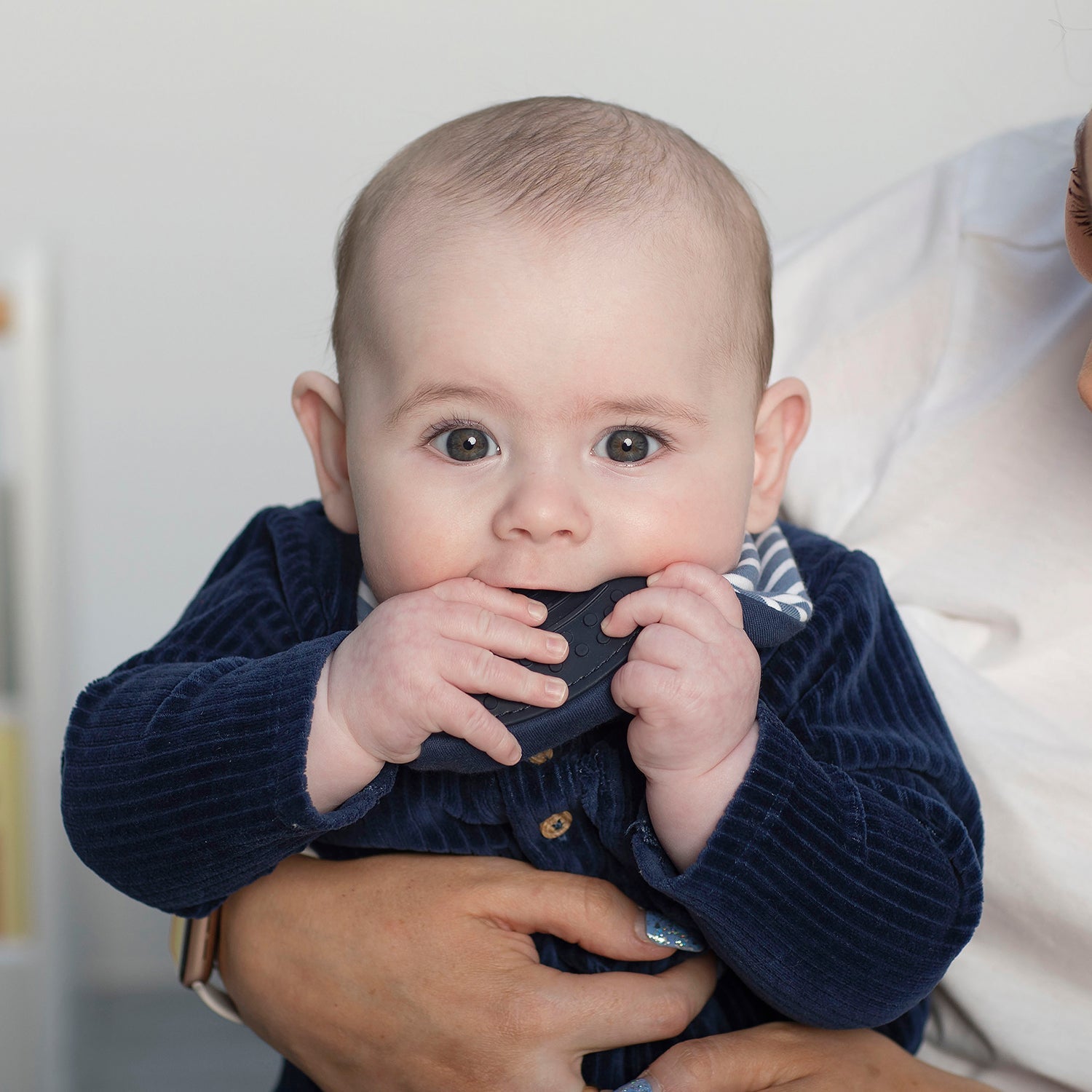 The attached soft and pliable silicone teether offers a safe and satisfying chew for your little one! It even has an innovative dimpled design, to massage sore gums and help those teeth break through.