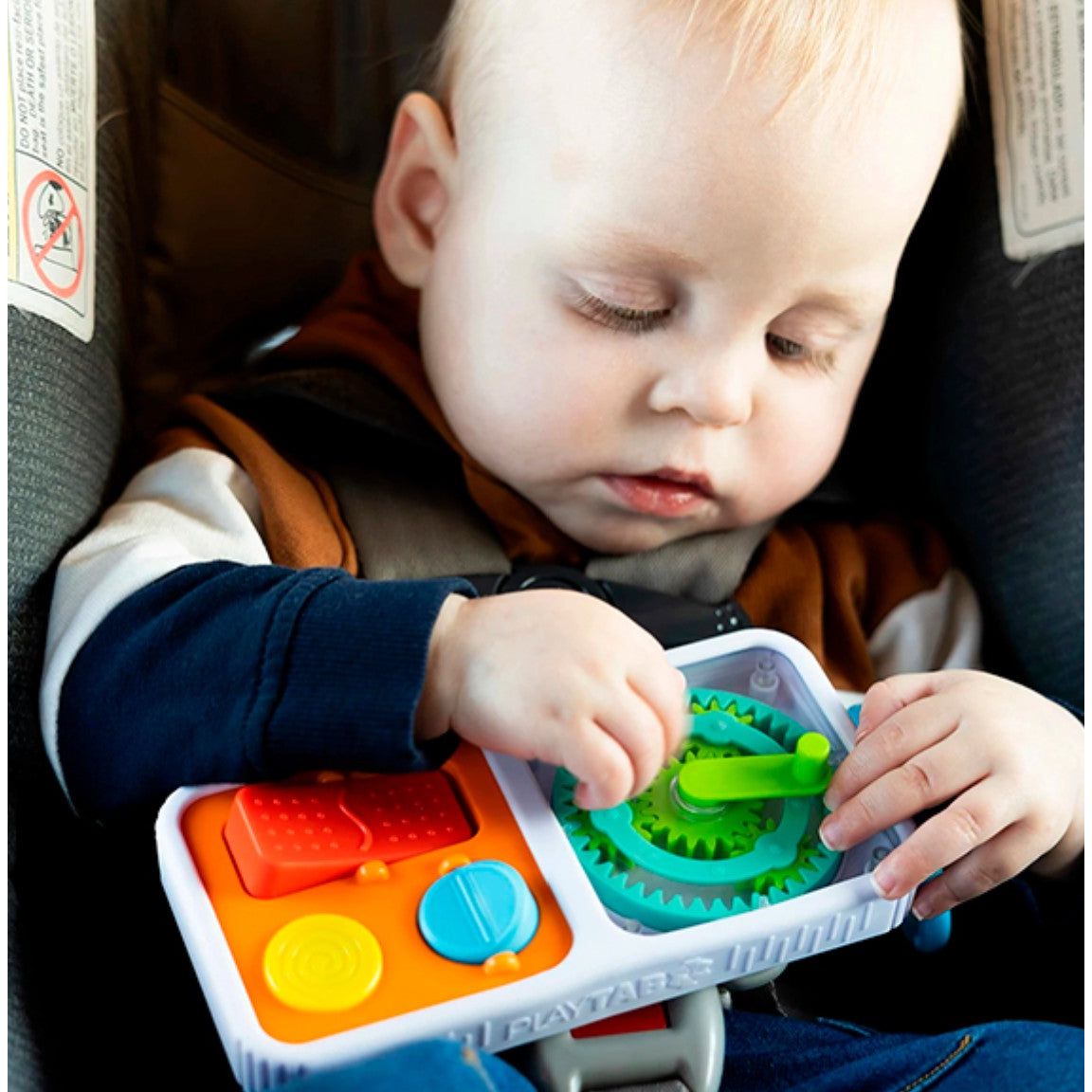 The two included sensory tiles can be popped in and out of the flexible, durable case, and you can switch them out for any other PlayTab tiles.