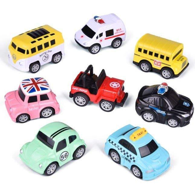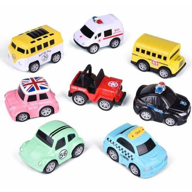 8 pack pull-back cars, all come in assorted style & colors: ambulance, school bus, off-road vehicle, taxi, police car, mini car and more