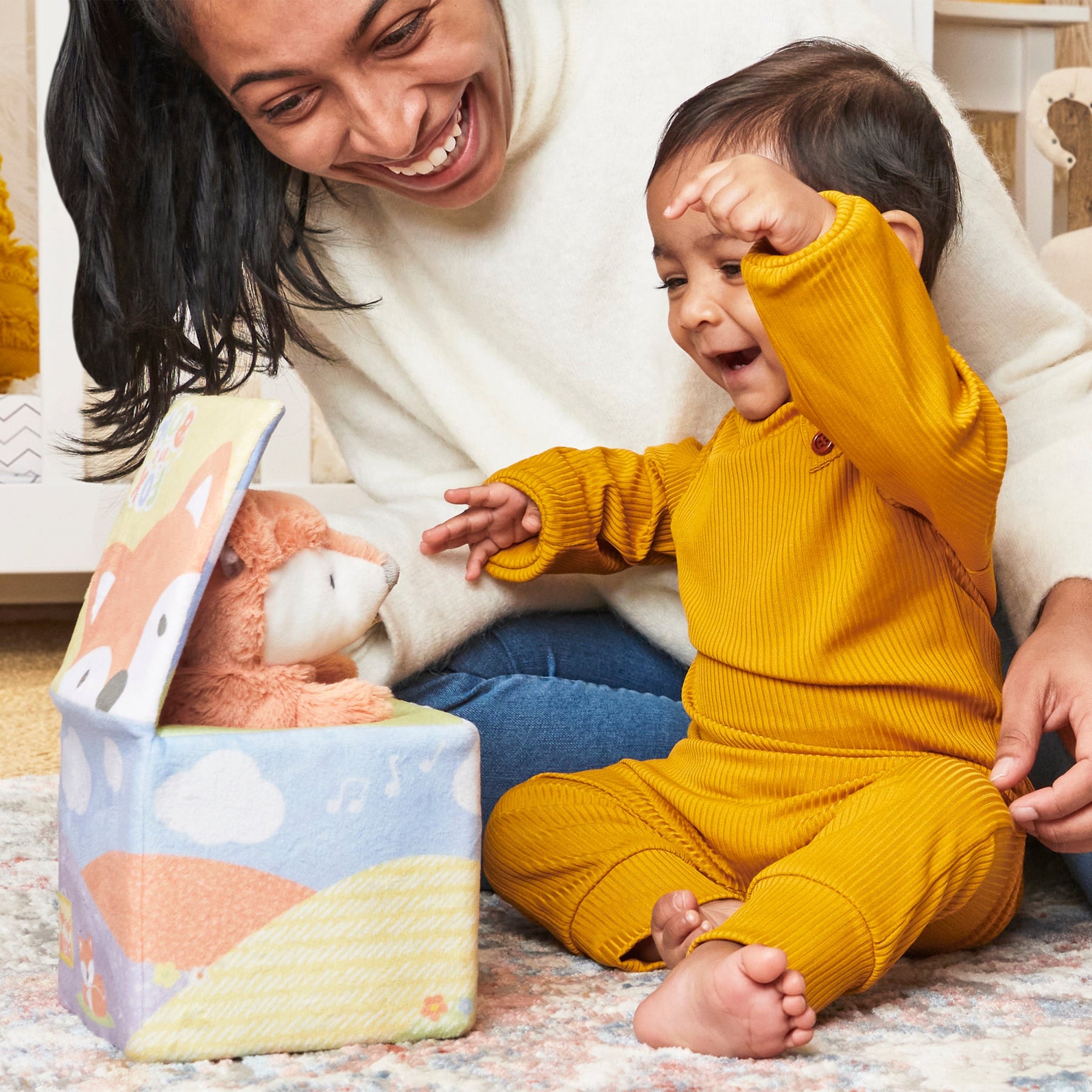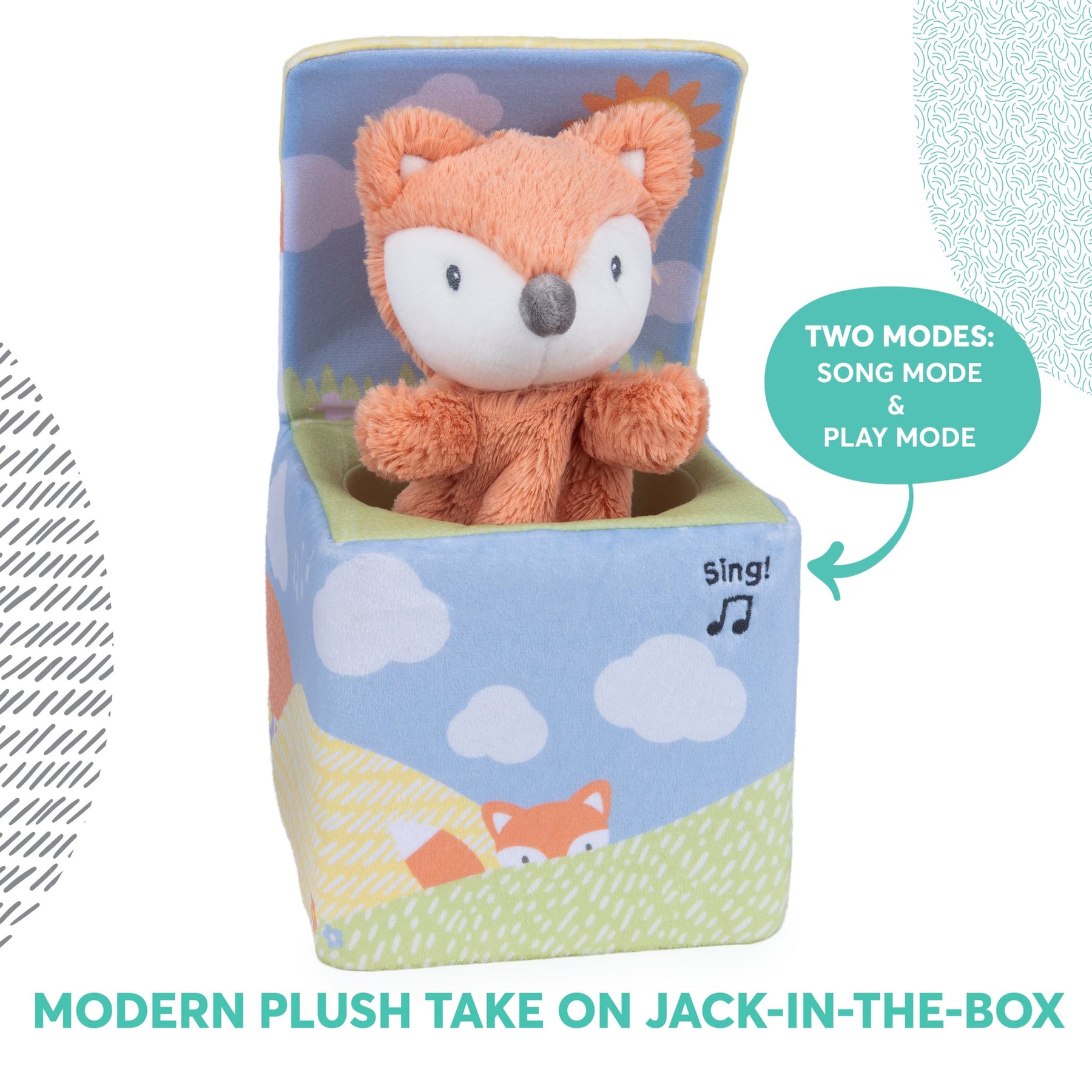 Reimagining the classic Jack in the Box format, our interactive fox features two play modes to surprise and delight babies. Play Mode encourages baby to tap anywhere on the box and coax Emory the fox out to play interactive games of peek-a-boo. In Song Mode, the fox gradually emerges from his hiding spot and sings a playful song for baby. Share in the moments of discovery and giggles with your little one!