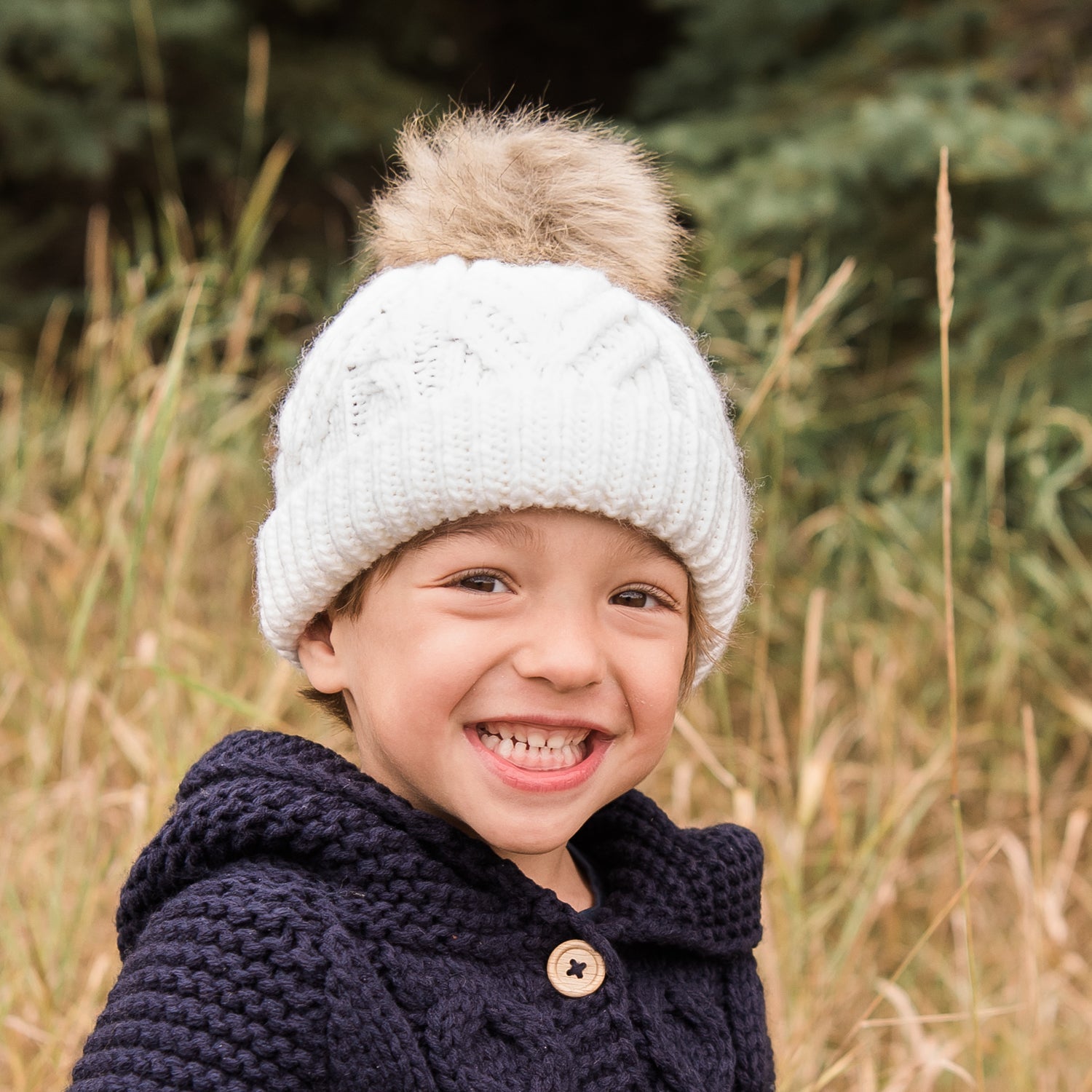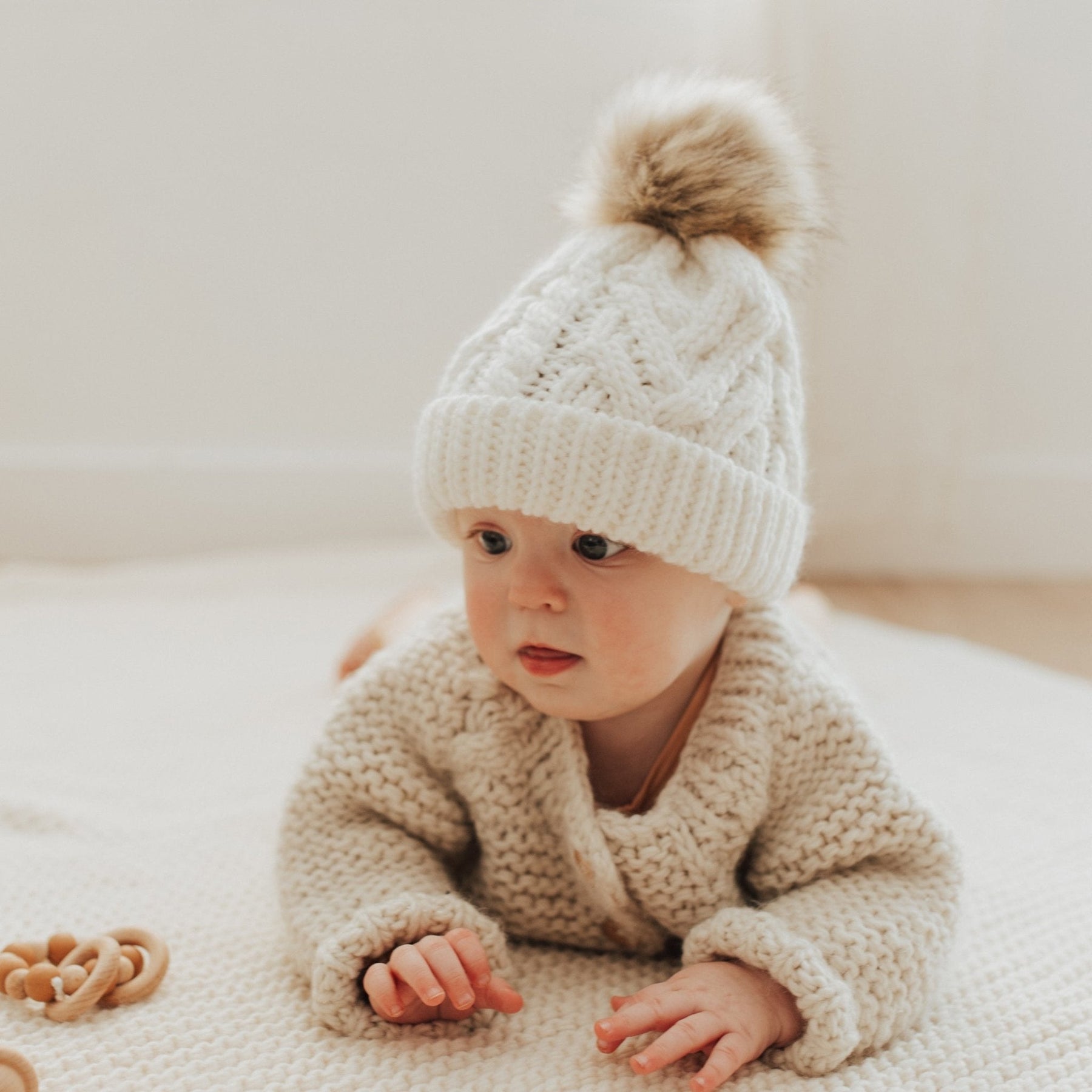 Super cozy hat hand-knit in Winter White hued Icelandic yarn is topped with a furry pom. This is a great cold weather hat and is perfect for gift giving. It makes a fun photo prop too. We offer this in other colors as well.