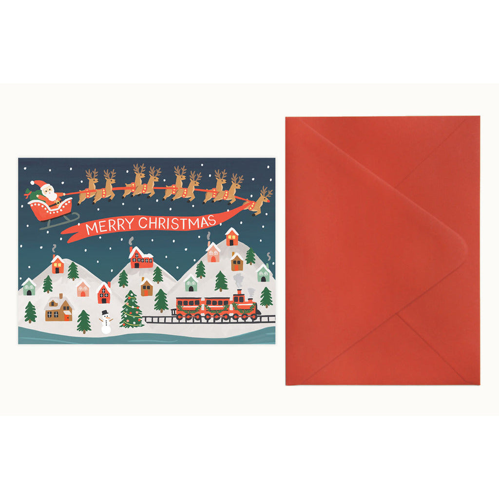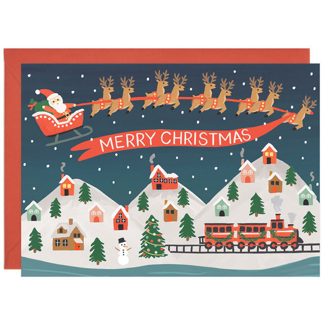 Santa and his reindeer, flying over the Christmas village, wishing everyone a Merry Christmas!