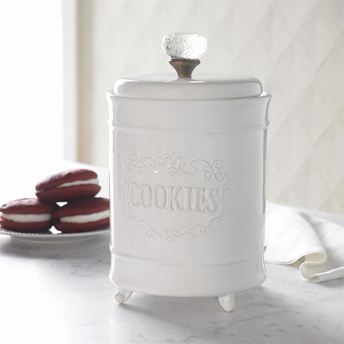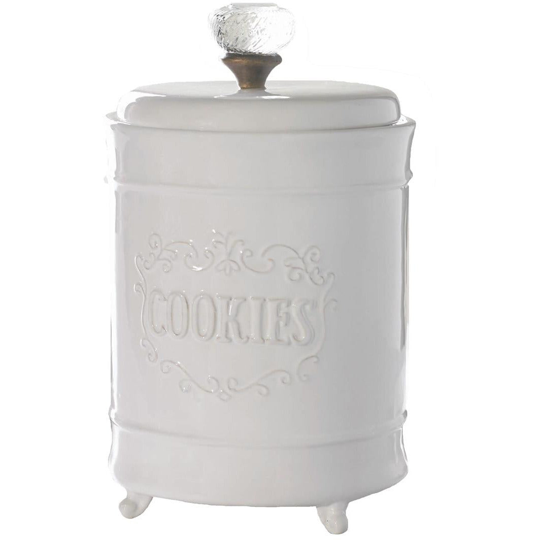 Footed ceramic container features detailed "COOKIES" embossing and vintage-style glass door knob handle on lid.