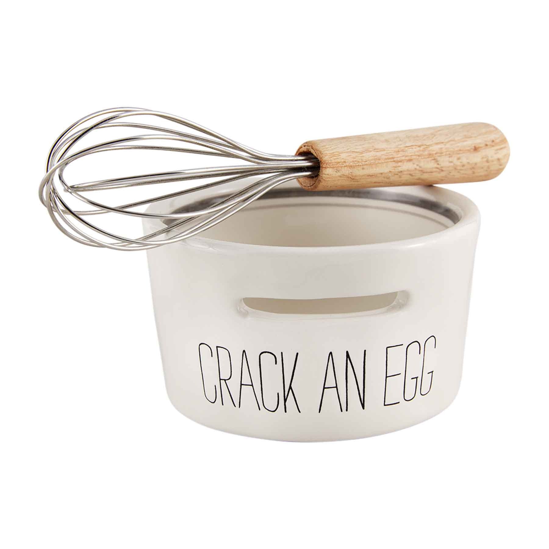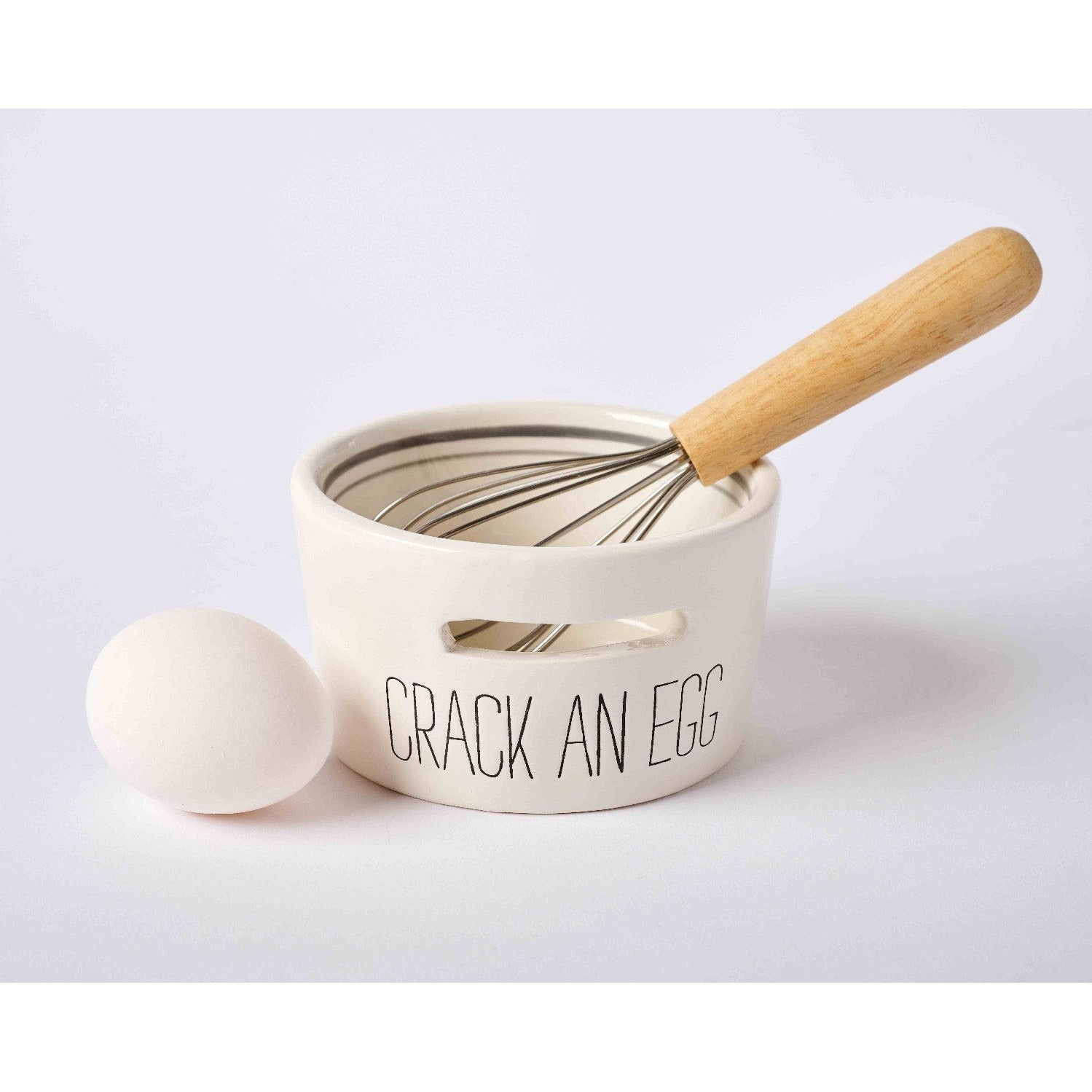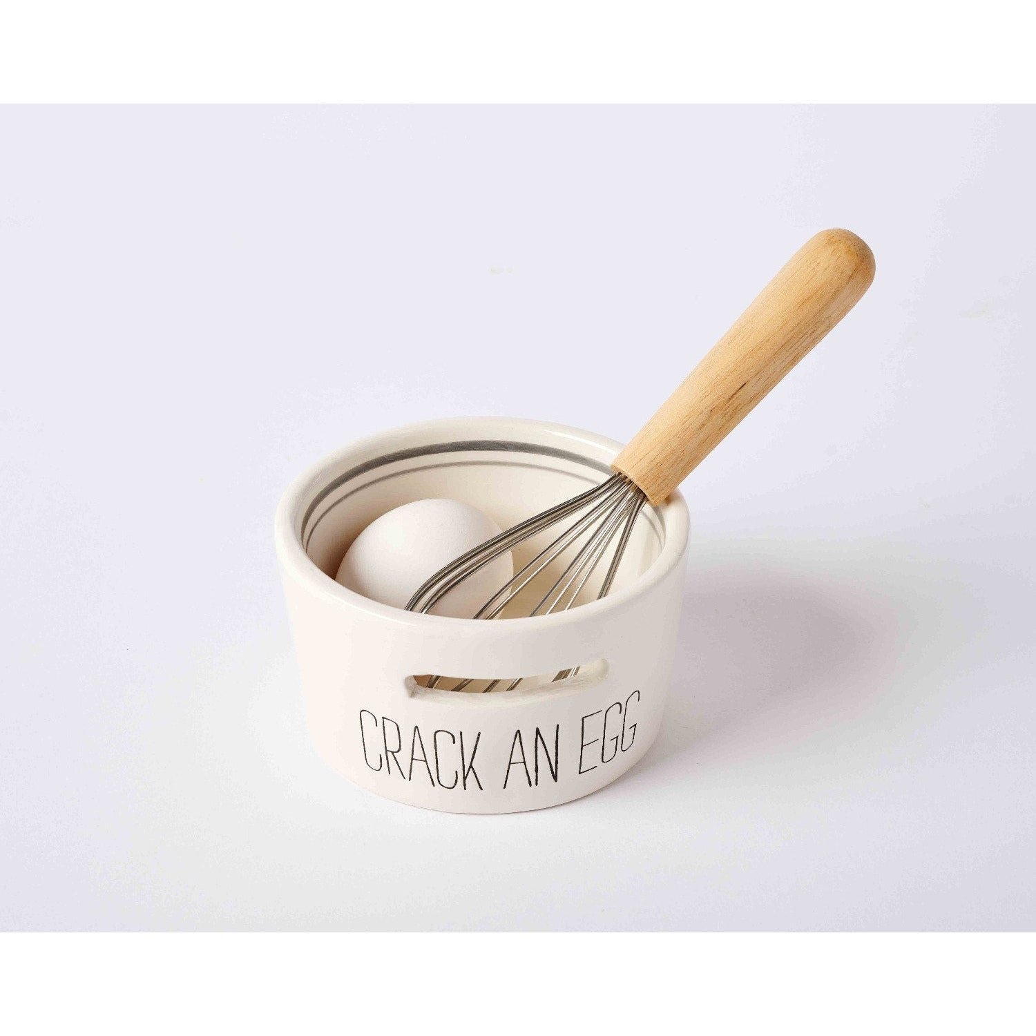 Crack an egg and enjoy with our Egg Separator and Whisk Set. The two piece set comes with a hand-painted ceramic egg separator. The egg separator features the sentiment "Crack and egg". The set also comes with a coordinating stainless steel and wood mini whisk. To use: break egg in dish and tilt to pour egg white through side opening.
