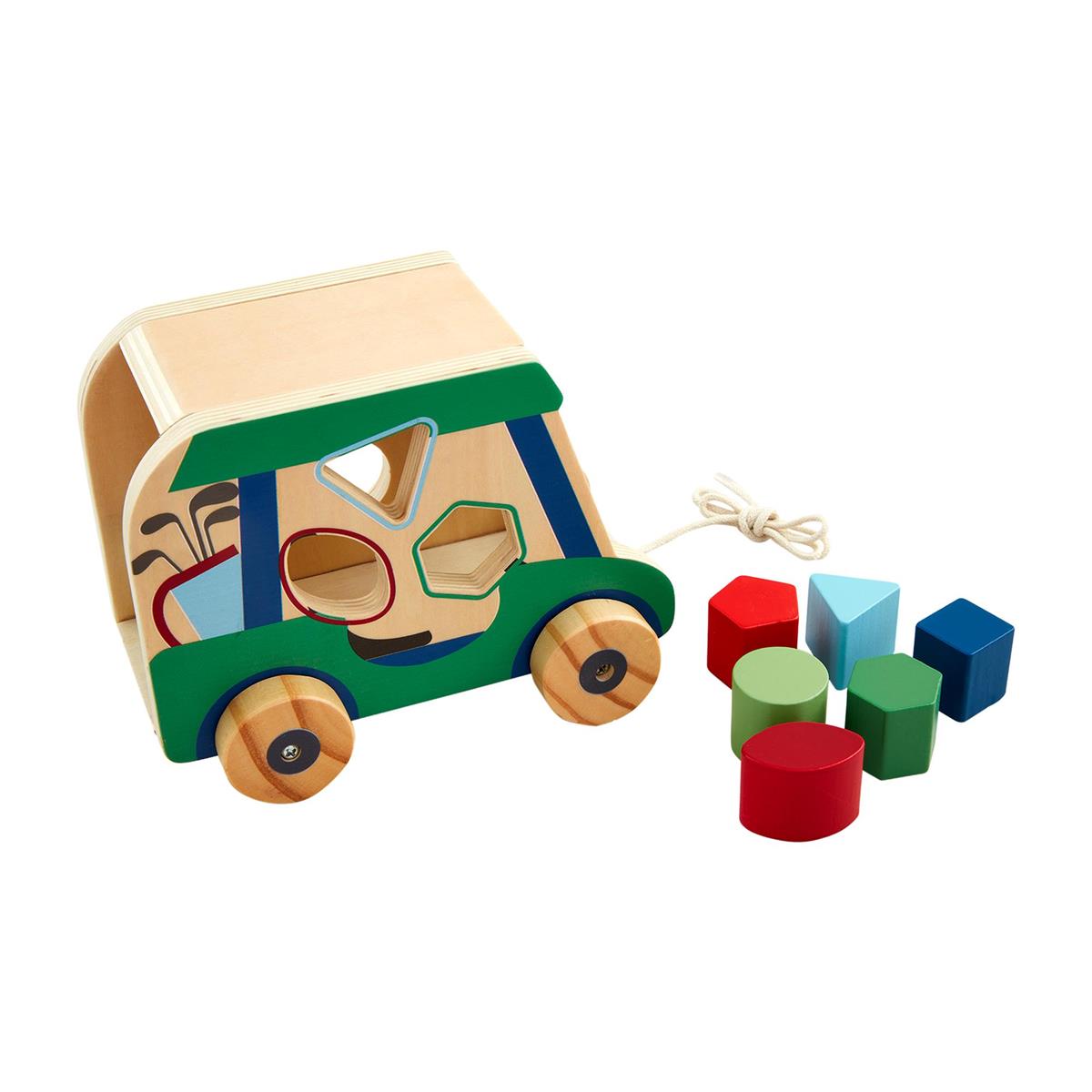 7-piece set. Wooden golf cart shape sorter features cotton rope pull cord and six wooden shapes. Ages 18M+.