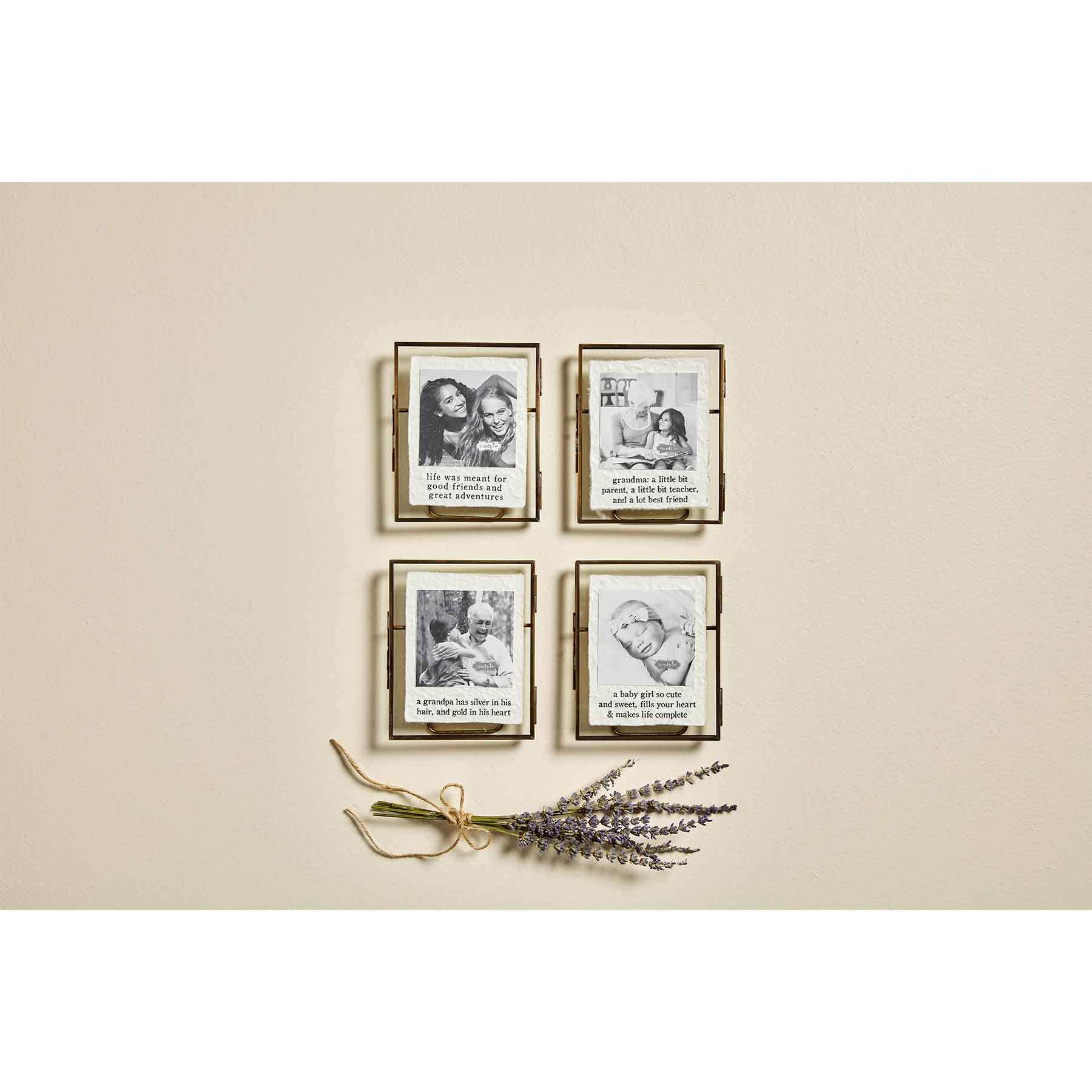This Grandpa Glass Picture Frame is made just for Grandpa! The brass finished frame features pressed glass panes to hold 3" x 3" photo and sentiment parchment paper matting. The sentiment reads "A grandpa has silver in his hair, and gold in his heart". The frame stands with easel.