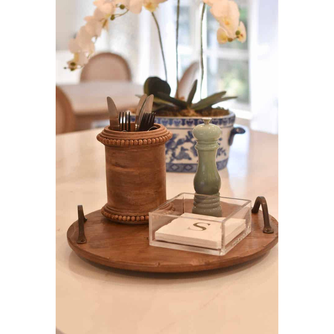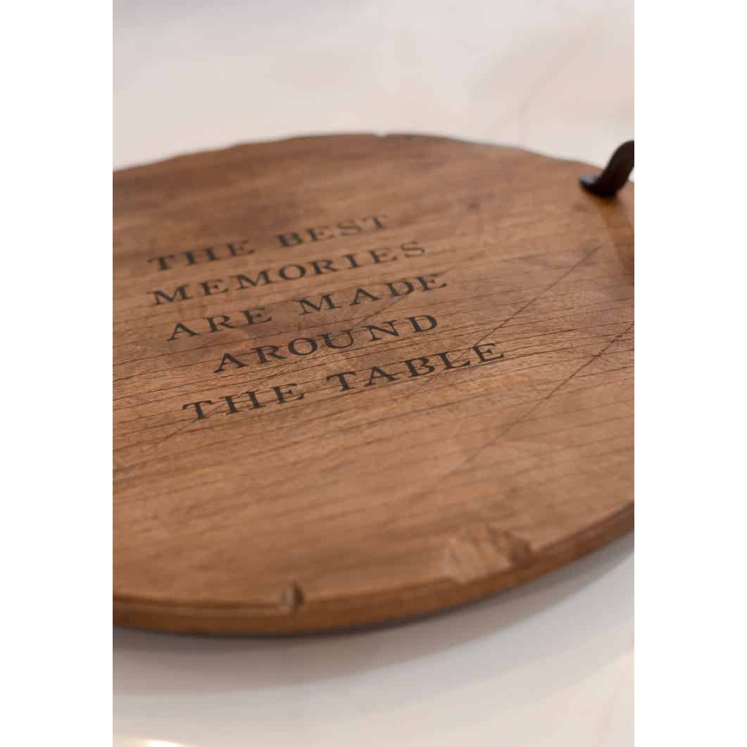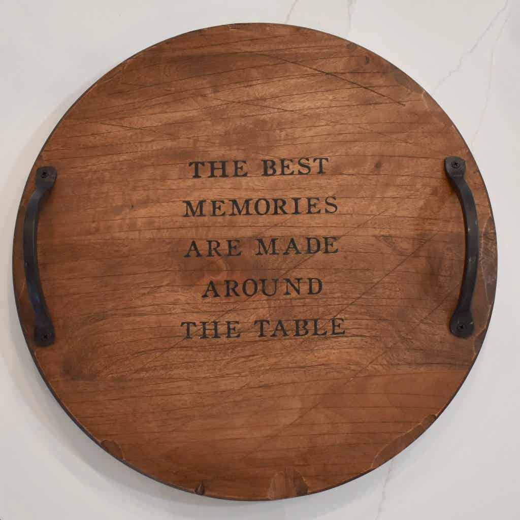 Our Memories Wood Lazy Susan is so unique. The mango wood Lazy Susan features an etched sentiment surface. The lazy Susan also features dimensional metal handles. This piece features a distressed finish and unique markings, making each piece different. This piece is intended to have a weathered style. We love to style by adding other decorative pieces to the top like candles, napkins, and more.
