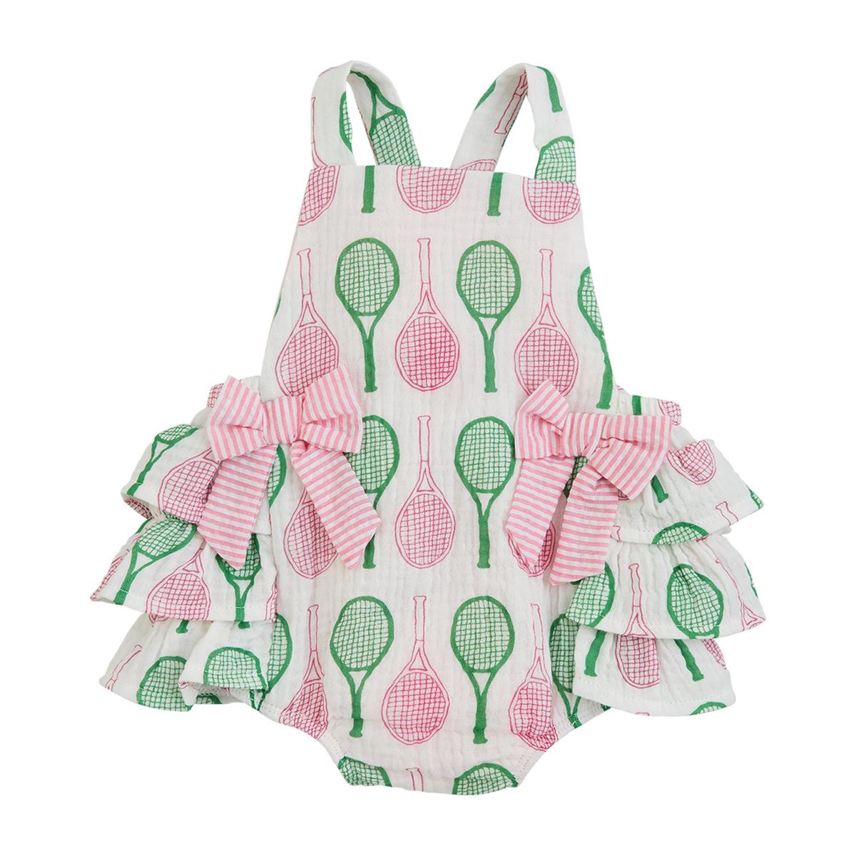 Lined cotton gauze sunsuit features tacked seersucker bows and ruffle bum. Inner leg snaps.