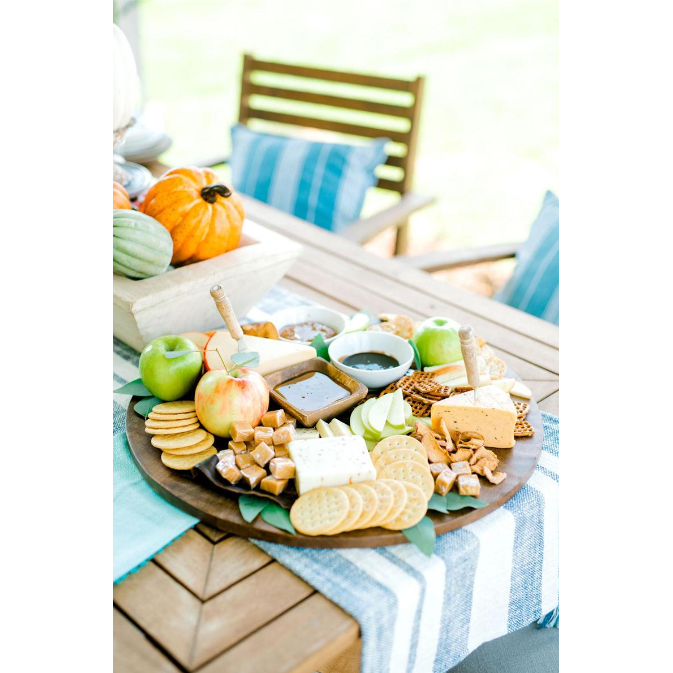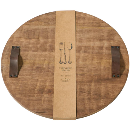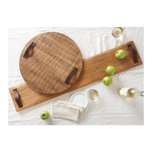 Generous sized mango wood serving board features hand-carved irregular edge and genuine leather handles.