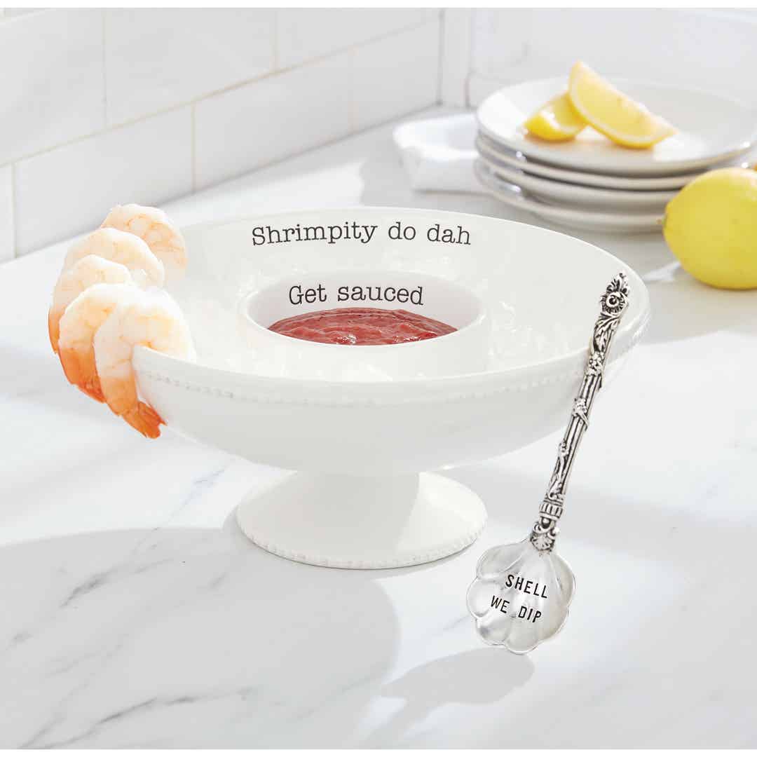 Shrimp cocktail serving dish features debossed "Shrimpity do dah" sentiment on inner rim, debossed "Get sauced" sentiment on integral dip bowl, raised beaded detail and arrives tied with vintage-style scalloped silverplate serving spoon with stamped "SHELL WE DIP" sentiment.