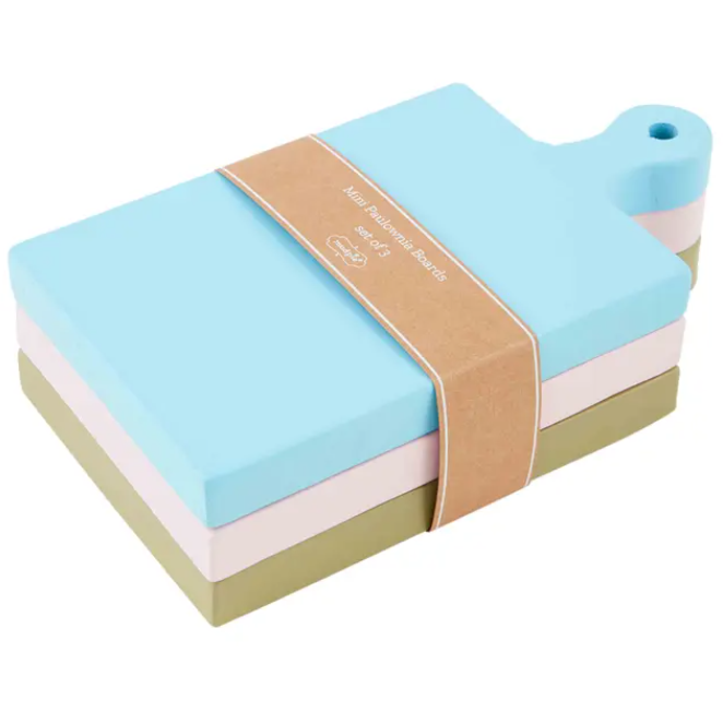 Spring into the season of hosting with our Spring Mini Cheese Board Set. The set comes with three hand-painted paulownia wood mini paddle board. The boards arrive tied together, but each feature a unique Spring color. This set includes pink, blue and green serving boards.
