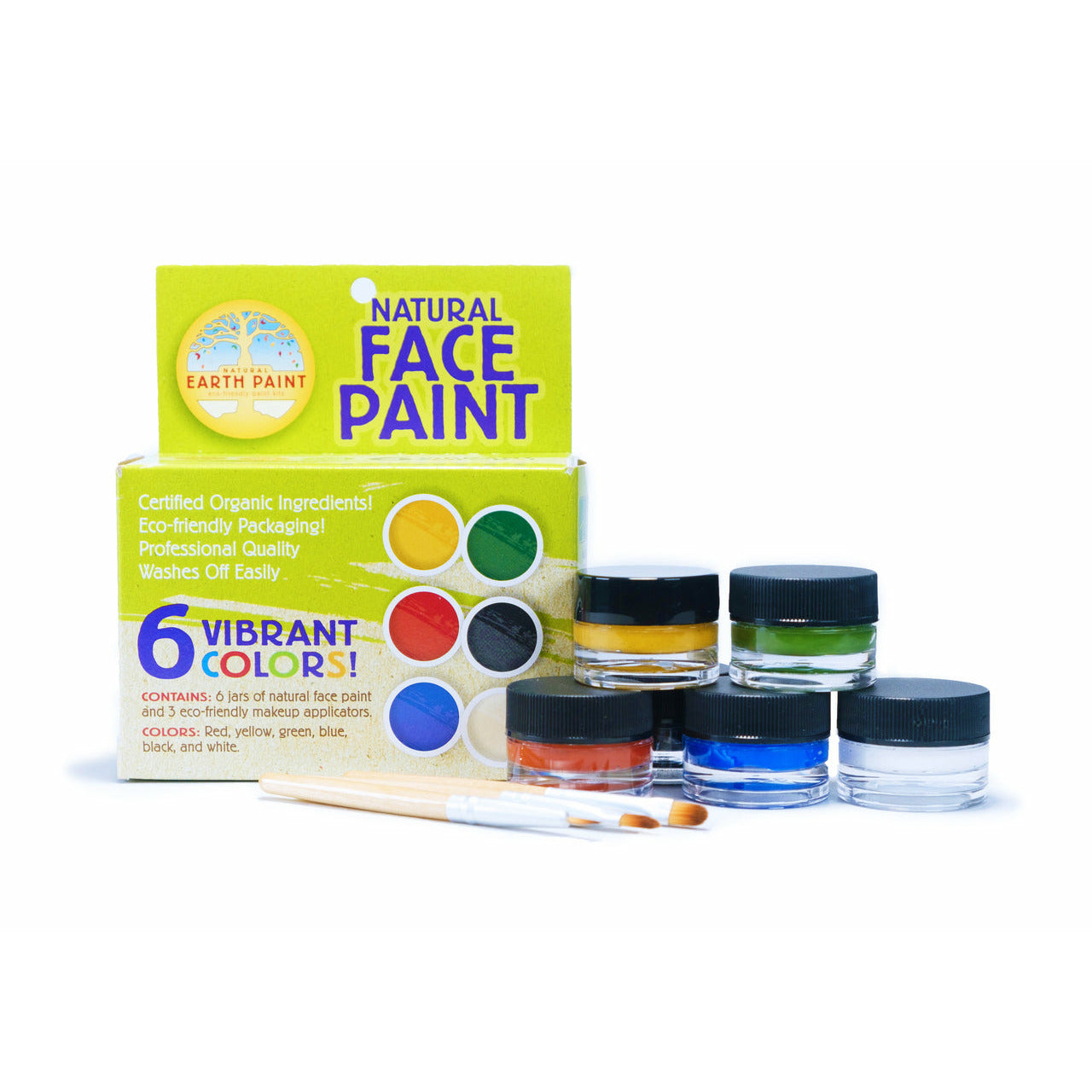 - Six containers of natural face paint, including Red, Yellow, Green, Blue, Black, and White