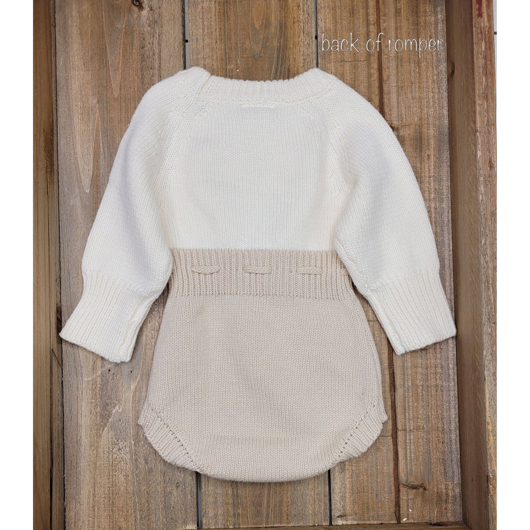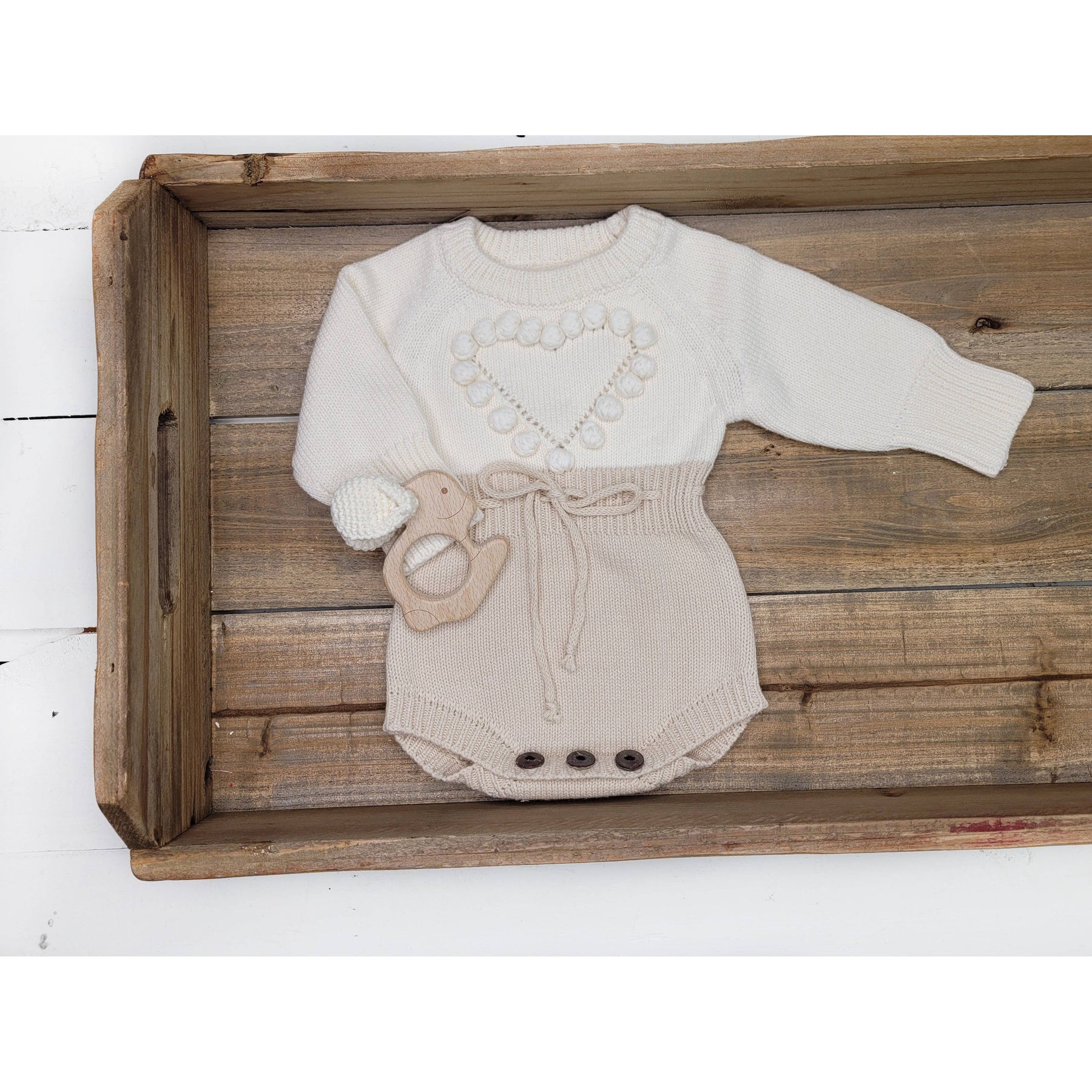 100% cotton sweater baby girl romper Heart Romper with 3 wooden buttons for easy diaper changing and cotton draw string at waist. Available in Beige Tan color. Available in sizes newborn -24 months This listing has 3 set options Romper ONLY Romper with matching Knit headband bow Romper with matching knit headband bow and matching socks Toy props sold separately Current batch runs true to size| order as usual