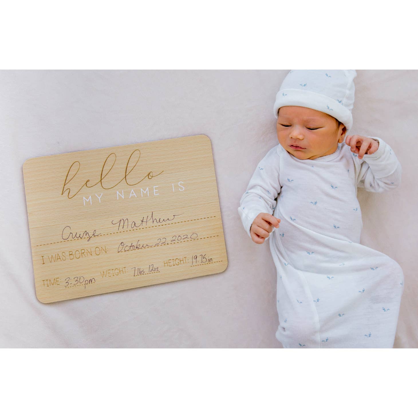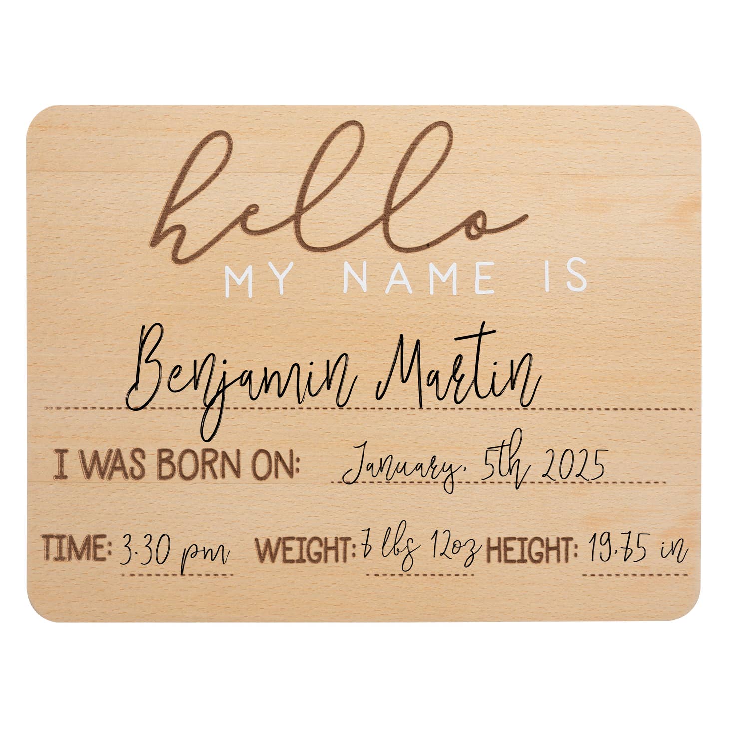 • Be ready for baby’s arrival with this wooden “hello my name is” baby welcome sign and photo prop board • Includes wooden sign engraved with “hello my name is,” “I was born on,” “time,” “weight,” and “height” and a black pen to write in all of baby’s personalized information • Take a photo of baby girl or baby boy next to this baby arrival sign in the hospital and share your special moment with friends and family on social media • Once you bring your little one home this gender-neutral baby sign makes perfect décor for woodland nurseries, safari nurseries, car nurseries and so much more • Board Dimensions: 11” W x 8.25”H x 0.125” D