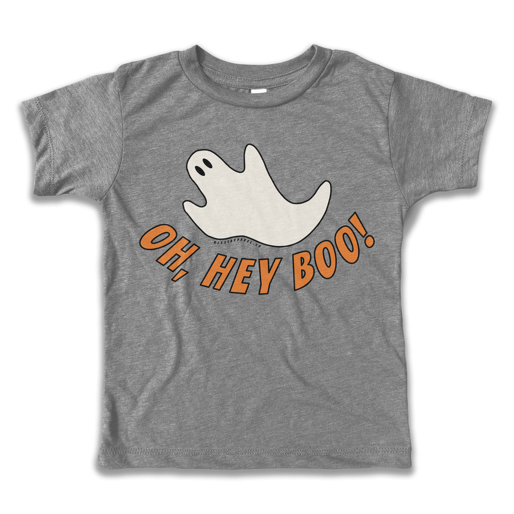 Hey Boo Tee. Super soft grey triblend tee (50% polyester / 25% cotton / 25% rayon). Youth tees fit to the below sizes: