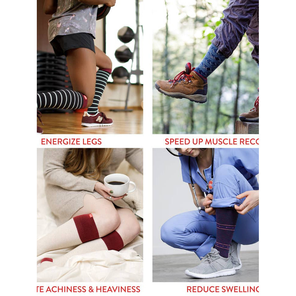 Made with premium cotton and 200-needle count for flexibility and comfort. Our socks offer moderate-firm compression (20-30 mmHg). 20-30 mmHg is considered medical-grade compression and generally recommended or prescribed by your doctor. This design also comes in a lower compression level of 15-20 mmHg. Compression level: 20-30 mmHg Material: 48% Cotton, 42% Nylon, 10% Spandex (Latex-free) Designed in Missoula, MT. Made in Taiwan.