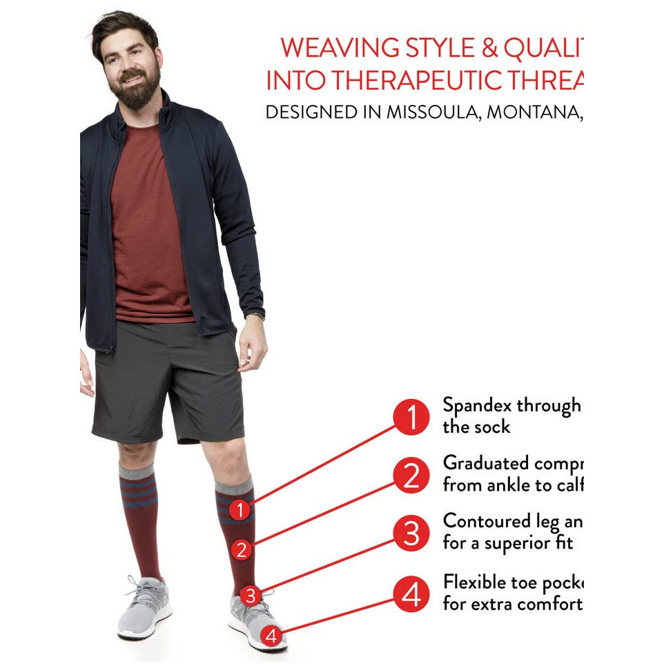 Made with high-quality fabrics and 400-needle count for flexibility and comfort. Our socks offer moderate-firm compression (20-30 mmHg). 20-30 mmHg is considered medical-grade compression and generally recommended or prescribed by your doctor. This design also comes in 15-20 mmHg compression level. Compression level: 20-30 mmHg Material: 91% Nylon, 9% Spandex (Latex-free) Designed in Missoula, MT. Made in Taiwan.