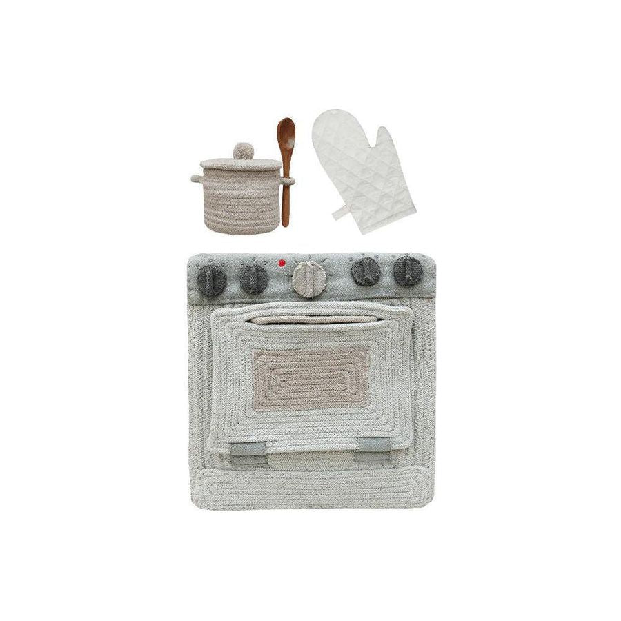 This textile toy basket washing machine is Lorena’s dream come true after more than two decades of making washable rugs. Little copycats can imitate Mom & Dad and toss the mini RugCycled® rug in the machine for a quick Rug-Cycle spin topped with some pretend detergent! This all-in-one storage basket and textile toy even features a swinging door, a turning switch, and a soap dispenser. The perfect set to stimulate infants’ symbolic playing!