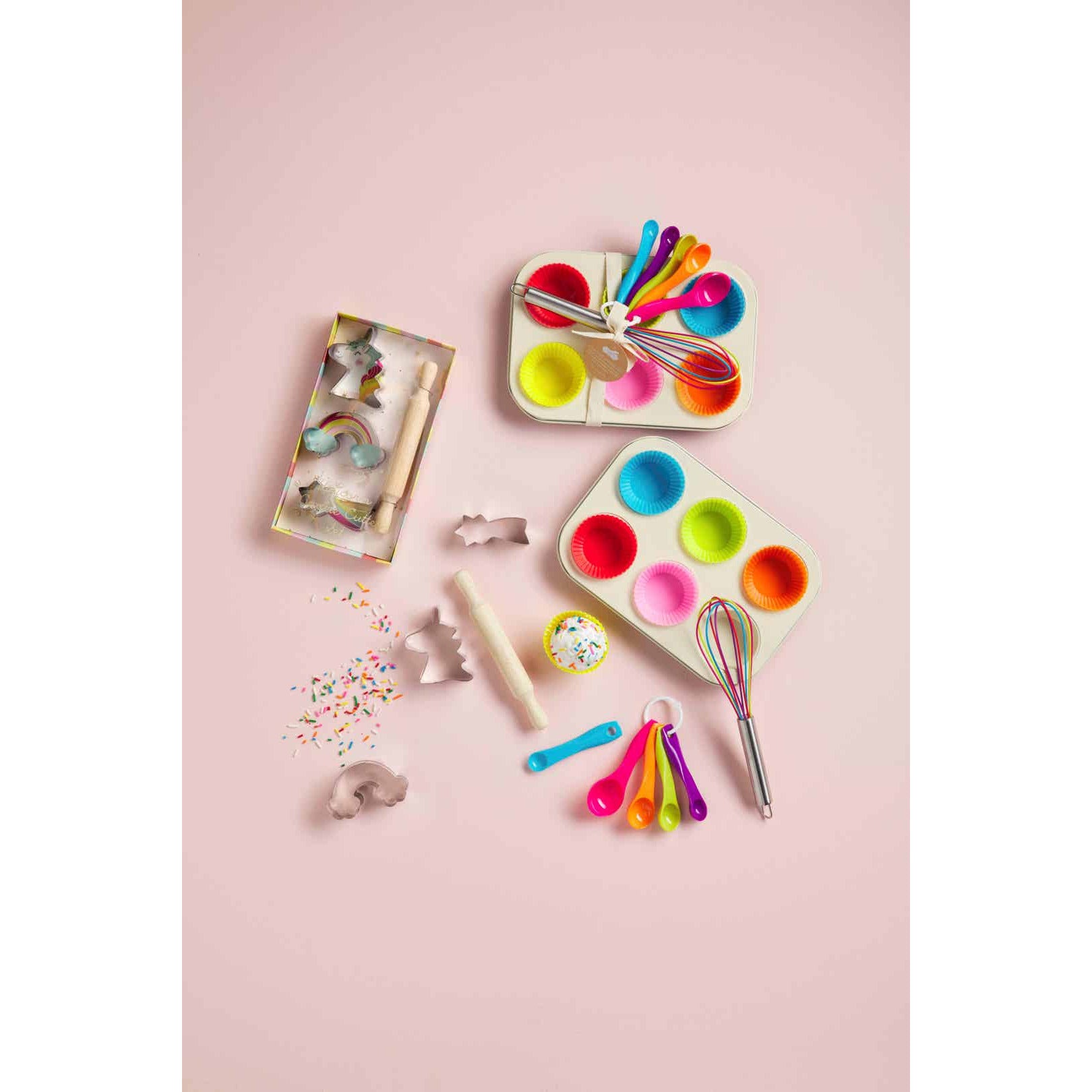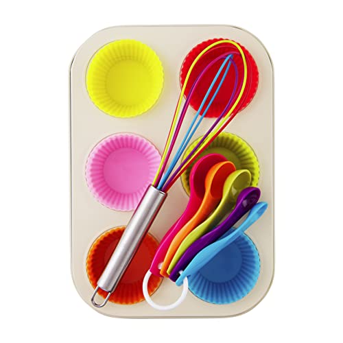 Encourage creativity with our Kid's Cupcake Baking Set. The nine-piece set includes an enameled muffin tin that fit our silicone cupcake liners perfectly. The set comes with a rainbow whisk, six silicone cupcake liners and a set of colorful measuring spoons. Great for a baker in training!