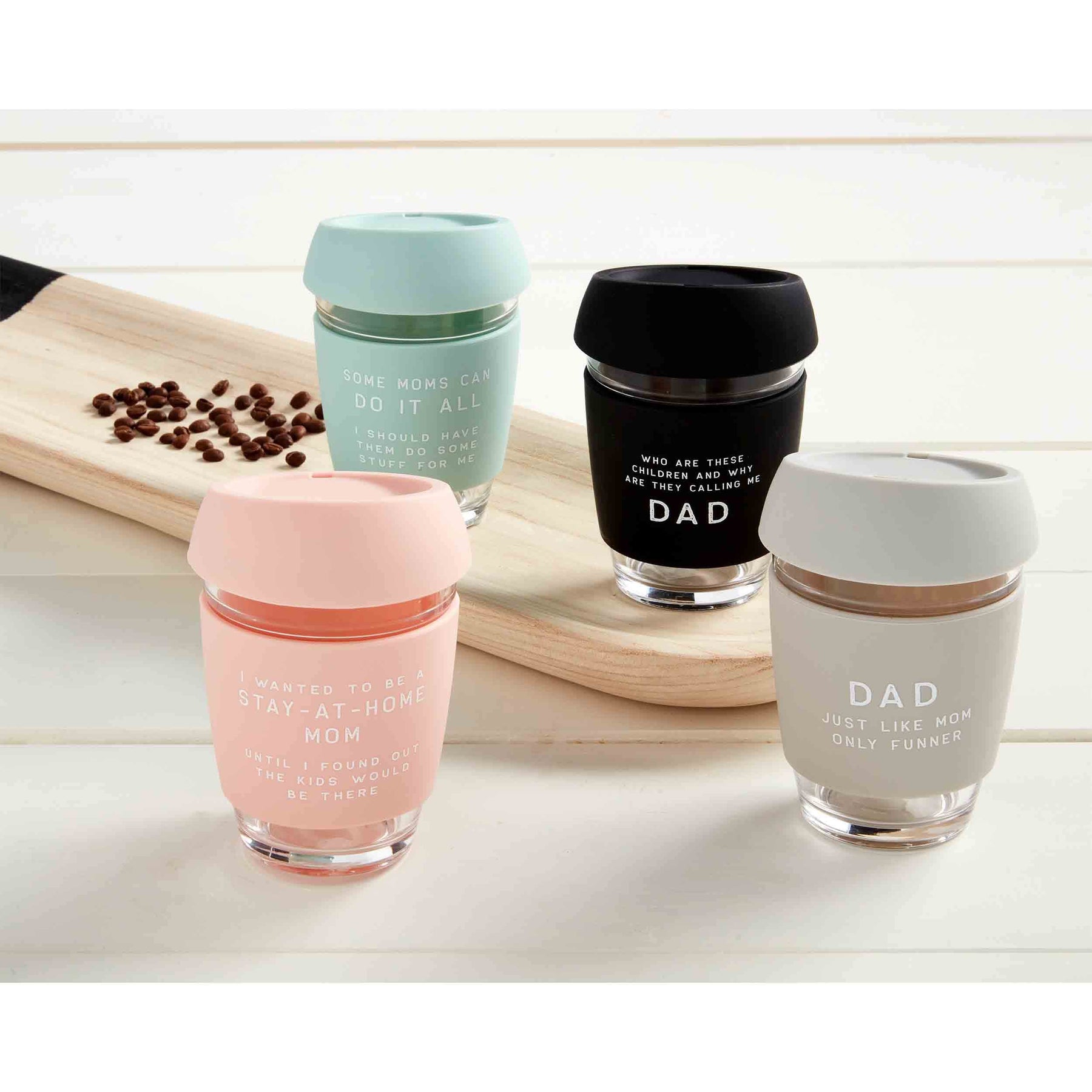 Here's to all the super dads, they'll love this Dad Black Coffee Travel Glass. The travel coffee glass features a silicone collar and lid. The travel glass features the sentiment "Who are these children and why are they calling me Dad" on it. The mug features a black collar and lid.