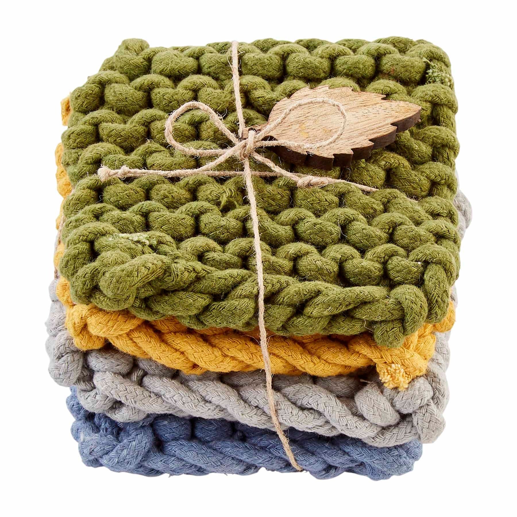 Get ready for fall entertaining with our light green crochet coaster set. The set comes with four crochet cotton coasters. The coasters arrive with a tie, showcasing a cute leaf to represent the season. The coaster set comes with four coasters - light green, gray, blue and yellow.