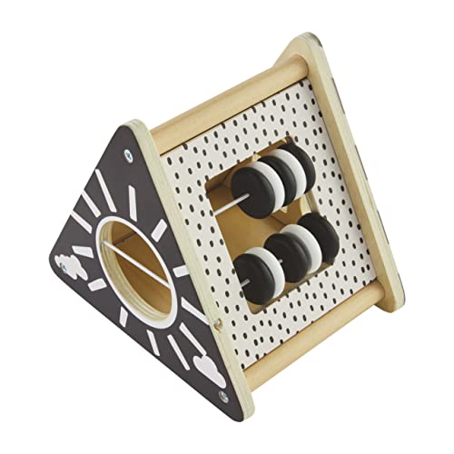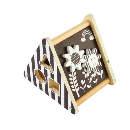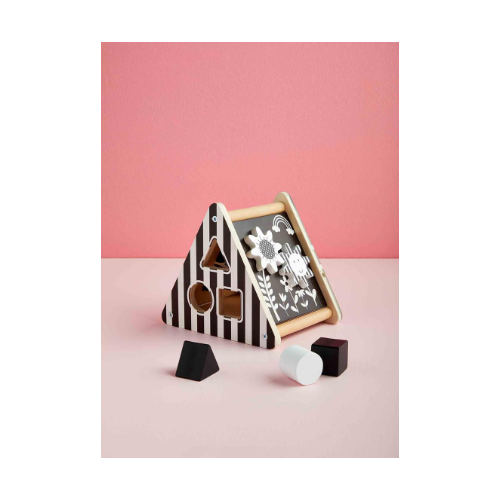4-piece set. Wooden triangle shape sorter comes with three wooden shapes. Toy features high contrast images and 3-D pieces to provide visual infant stimulation.