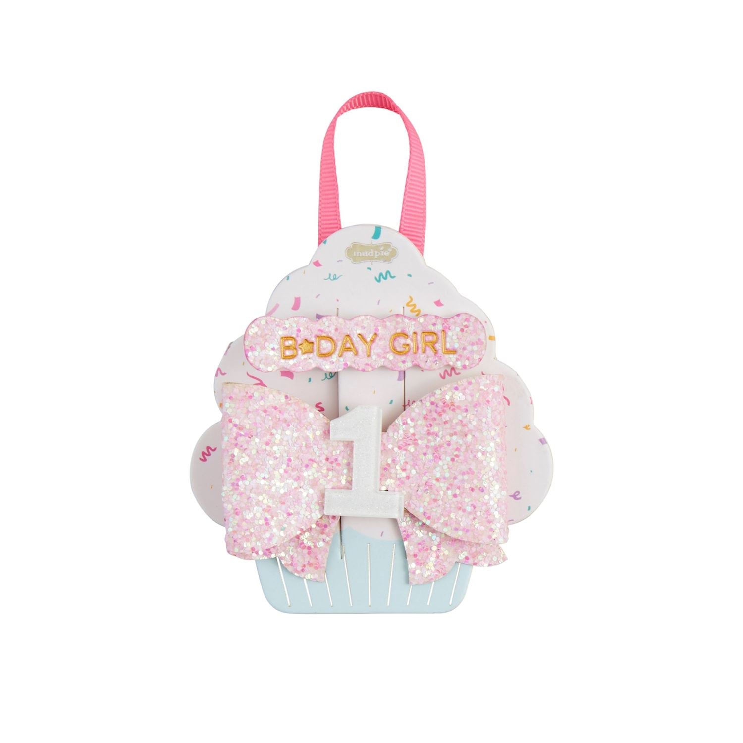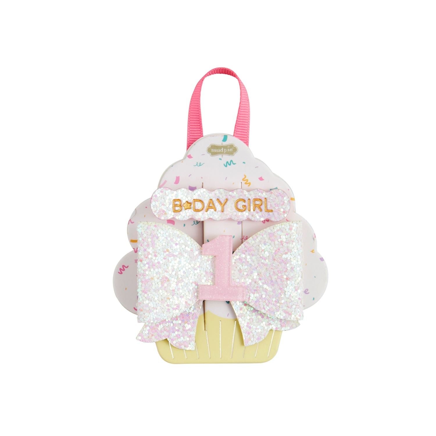 2-piece set. Glitter bow with center icon on alligator clip comes with coordinating acrylic b-day girl clip.