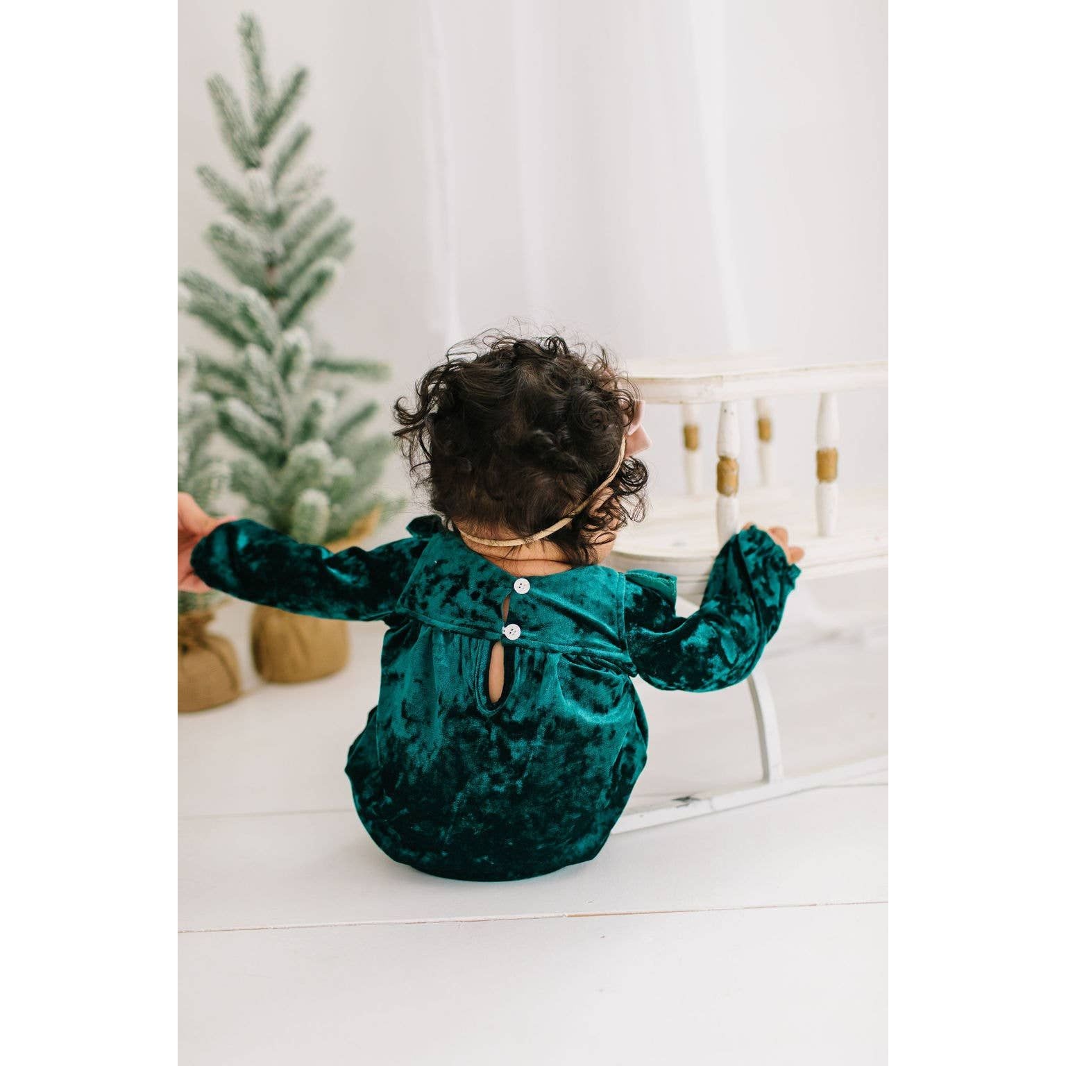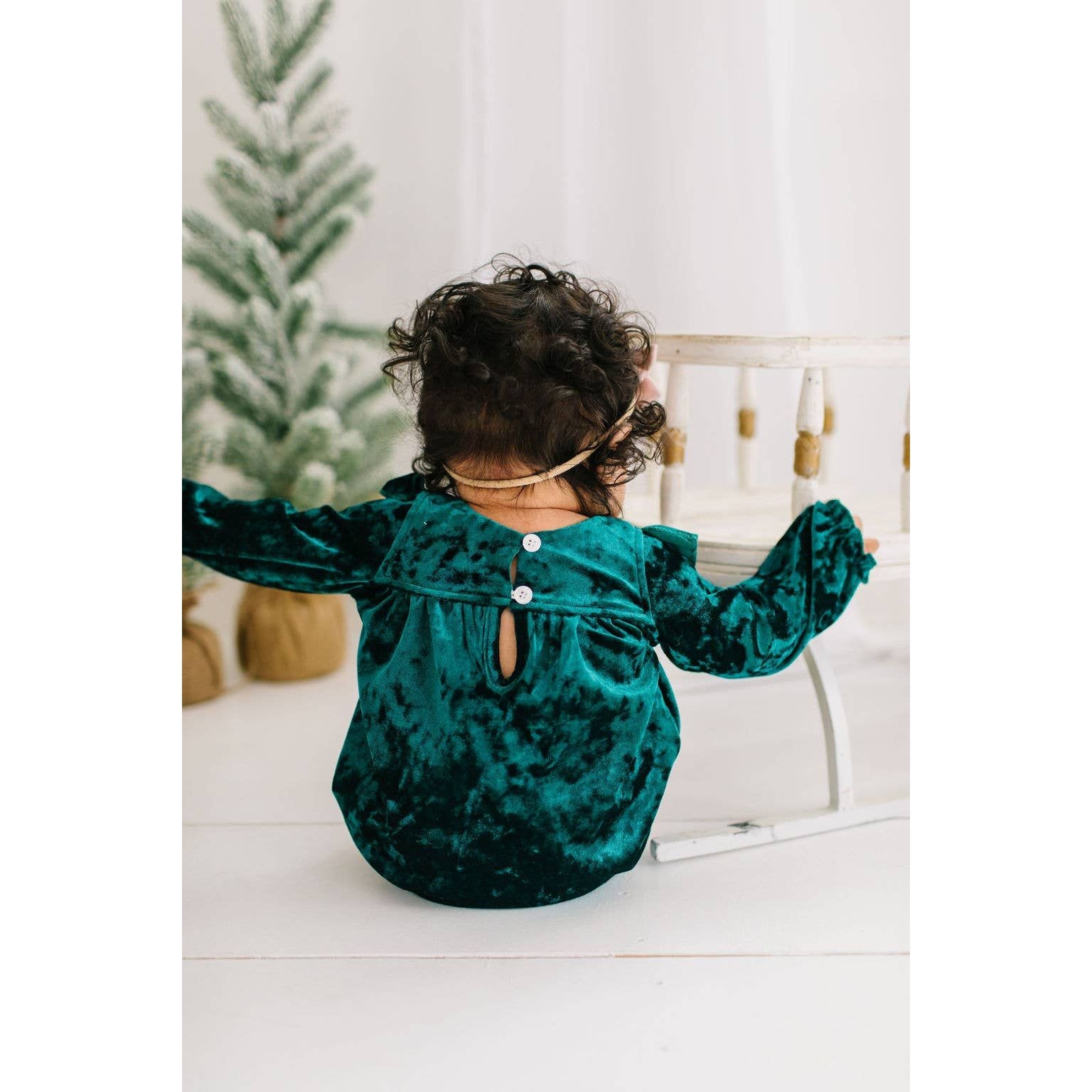 The Hayley Bubble is an elegant one-piece with thoughtful, vintage-inspired details. Made from soft and cozy velvet, it features flowy long sleeves with ruffled wrists, a square-shaped ruffle across the bodice, and a double button back with loop closure for easy dressing. A three-snap diaper closure ensures quick and simple changes.