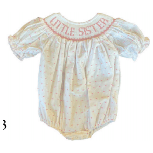 This sweet swiss dot Little Sister bubble coordinates with Big Sister Dresses, Little Brother Bubbles and Big Brother Johnjohn's.