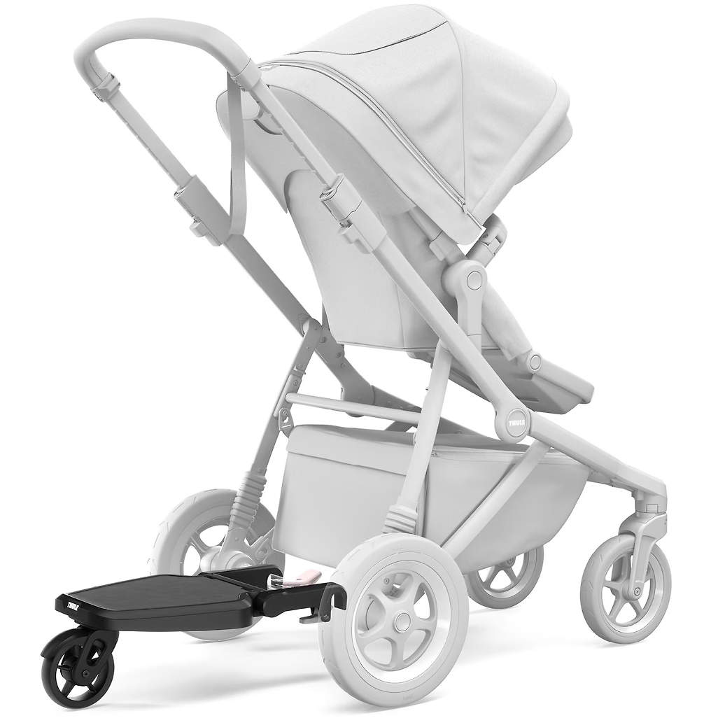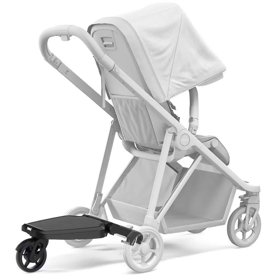 Thule Rider Board allows an older child to jump on board and ride along on the stroller, which makes this stroller board practical if you enjoy long walks with your kids. It is easy to install, has a puncture-free wheel, and anti-slip tape on top of the board.
