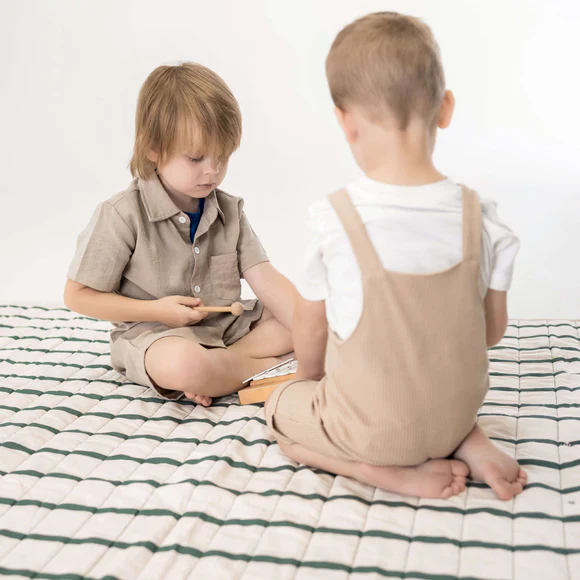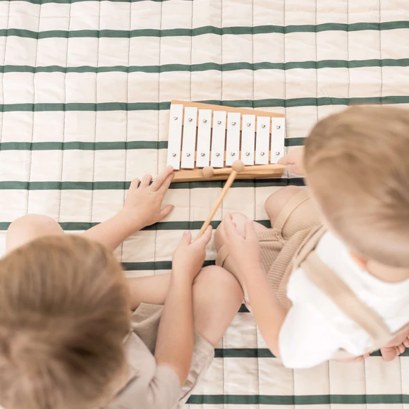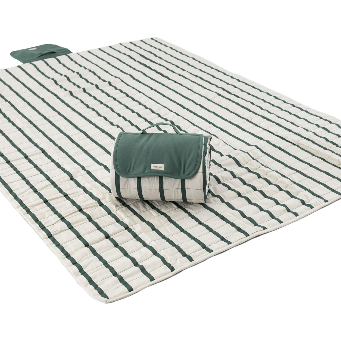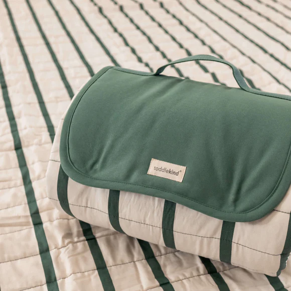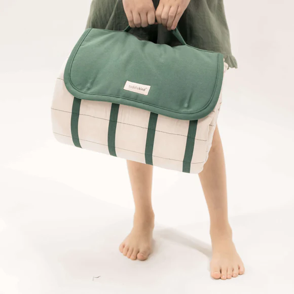 The quilted organic cotton top is soft and breathable, while the water-resistant coating and anti-slip backing keep it functional and family-ready. It folds easily and includes a carry handle for grab-and-go convenience.