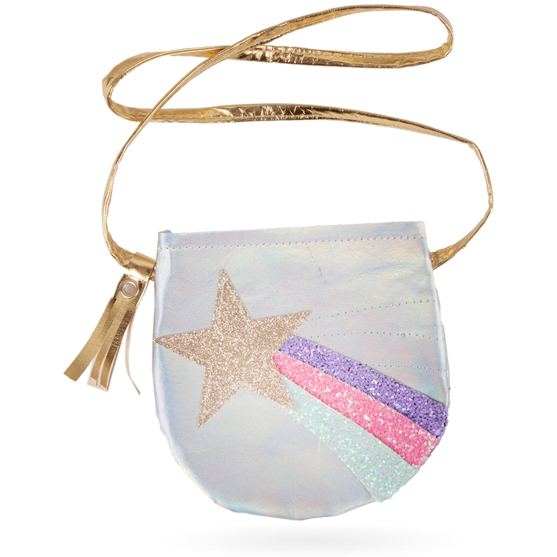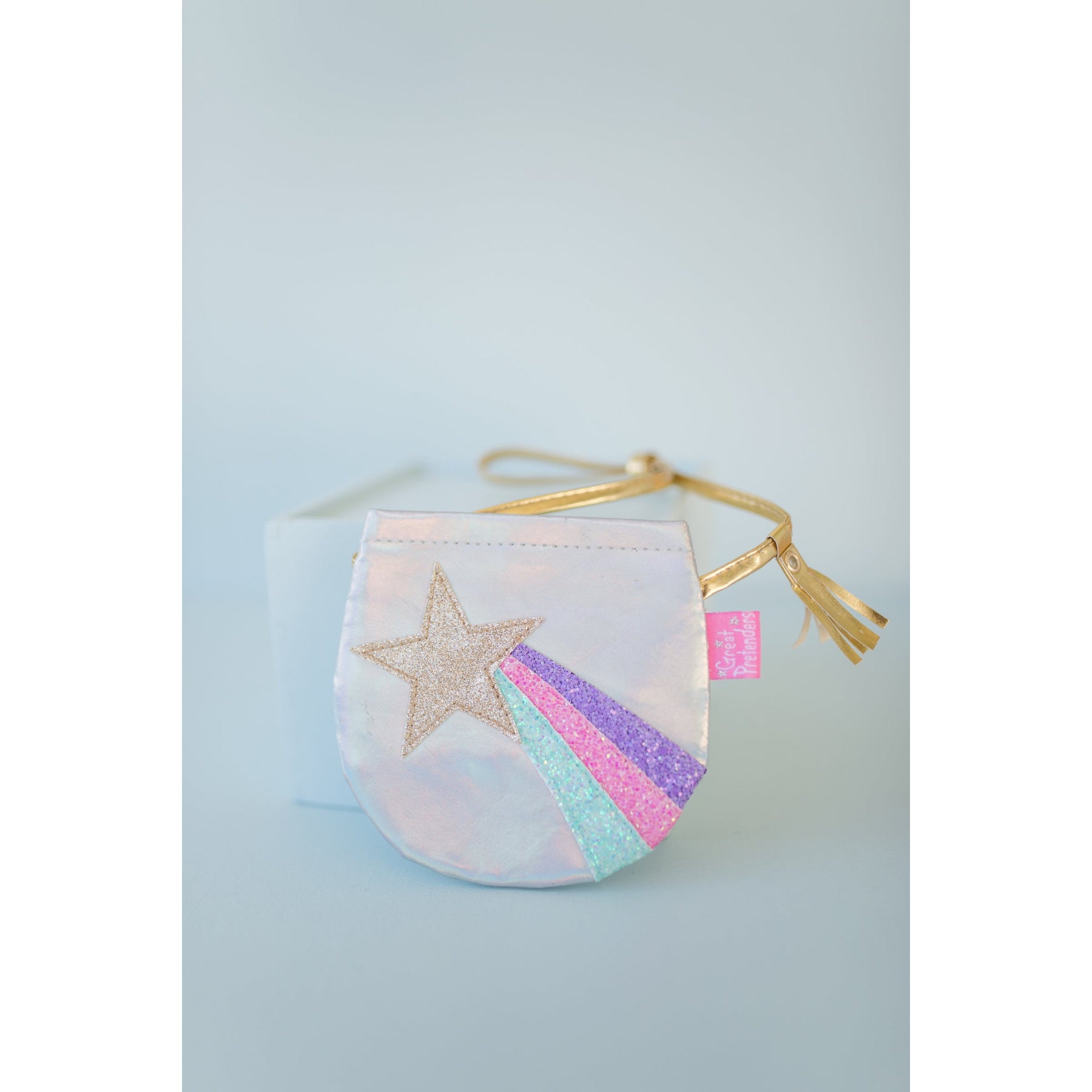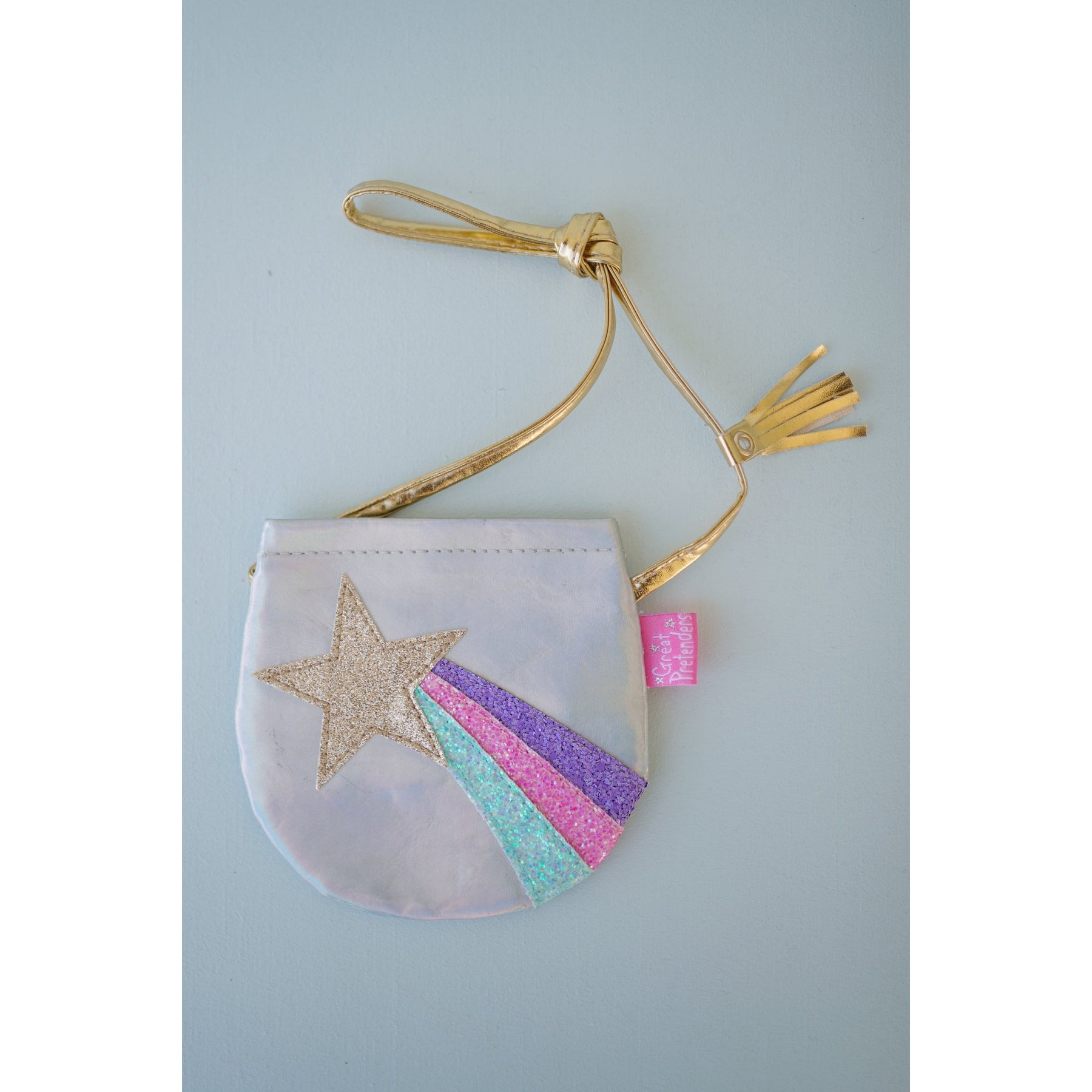 Adorable and vibrant silver purse with a fantastic Star design! It’s 5 x 5” purse size with a 12” perfectly sized golden shoulder strap with a tassel, & Velcro closure for easy fastening. Multicoloured path of the shooting star adds such a special effect to this irresistible little purse!