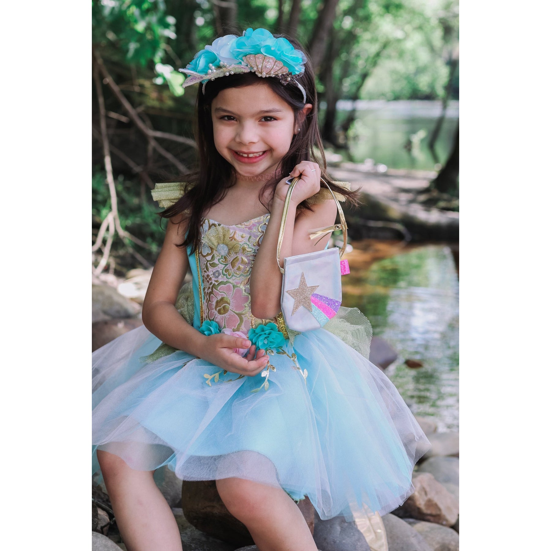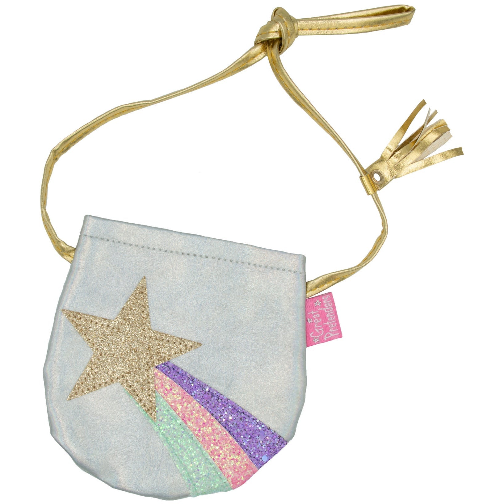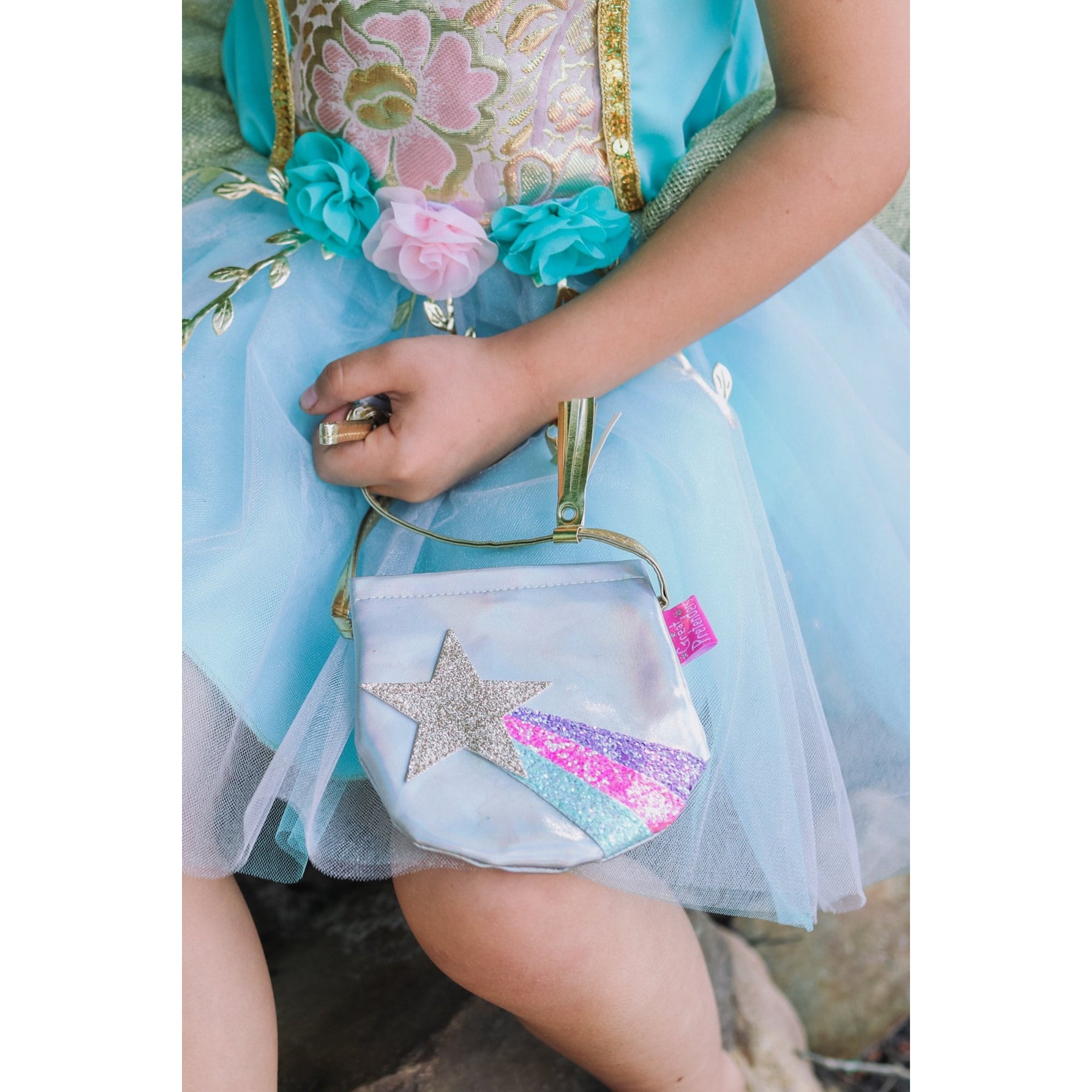 Adorable and vibrant silver purse with a fantastic Star design! It’s 5 x 5” purse size with a 12” perfectly sized golden shoulder strap with a tassel, & Velcro closure for easy fastening. Multicoloured path of the shooting star adds such a special effect to this irresistible little purse!