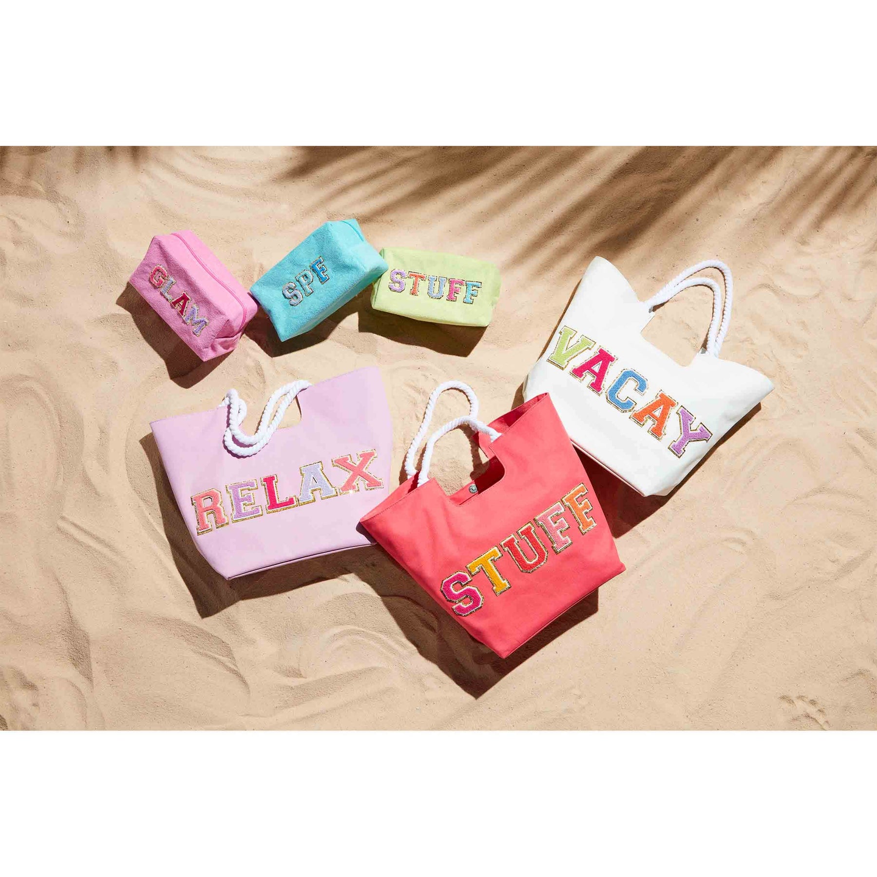 Our Canvas Coral Patch Tote Bag is simply sun-sational! The canvas tote features bright glitter patch lettering that features the sentiment "stuff". The tote bag also features twisted rope handles. Finally, the tote bag has a laminated wipe-clean interior making for easy cleaning after beach trips!