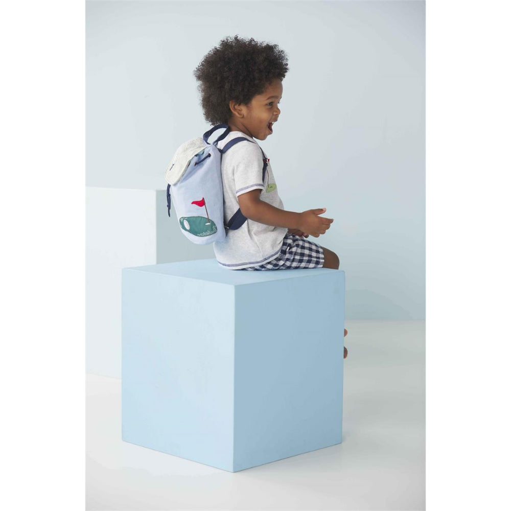 Our drawstring golf backpack is a perfect bag for toting everywhere! The appliqued oxford backpack features a drawstring. The backpack features a snap top closure with flap. The backpack also has a canvas I.D. patch. The backpack can be adjusted to fit your little one as the bag has adjustable straps.