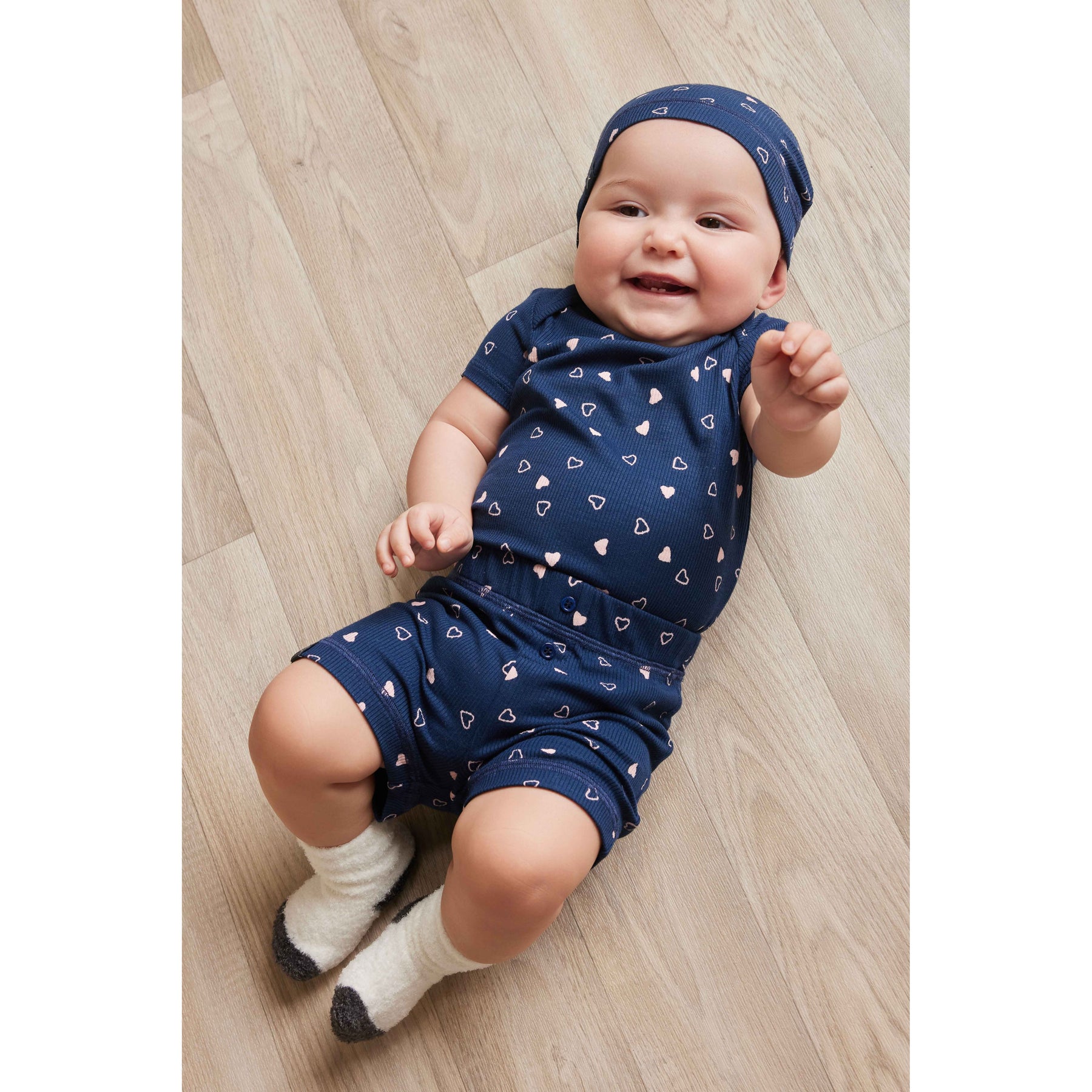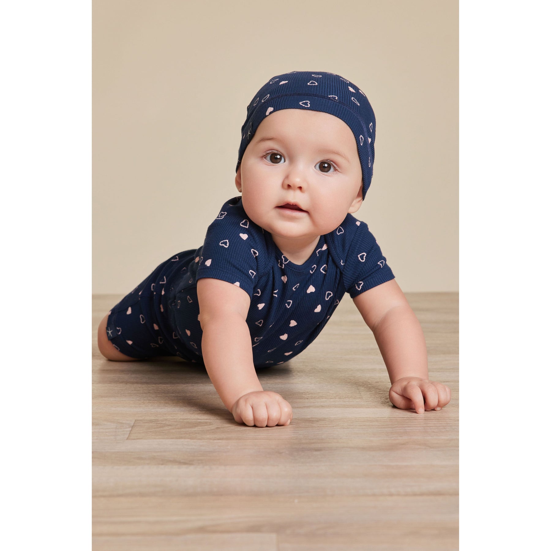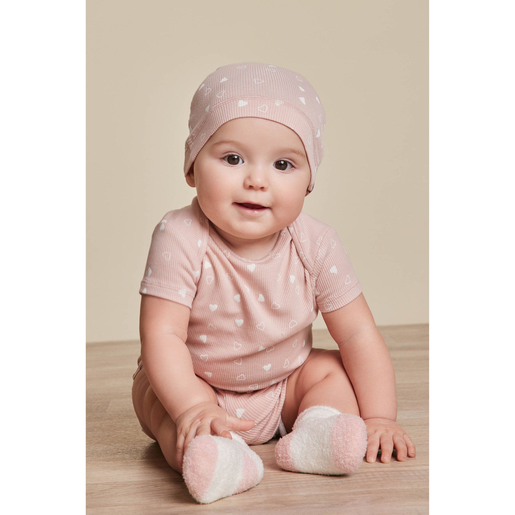 Our Ultra Soft Rib Baby Set is the perfect choice for your little one. Made with mini heart printed rib fabric, this 3 piece set includes a fitted beanie with cover stitch detail, a short sleeve onesie with convenient snaps at the bottom, and a comfortable short with an elastic waistband and faux fly with buttons. Your baby will love the cozy feel and adorable style.