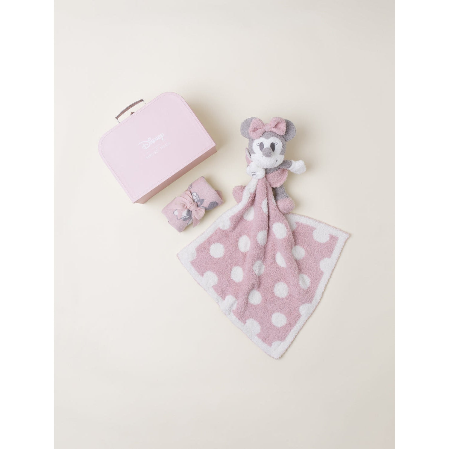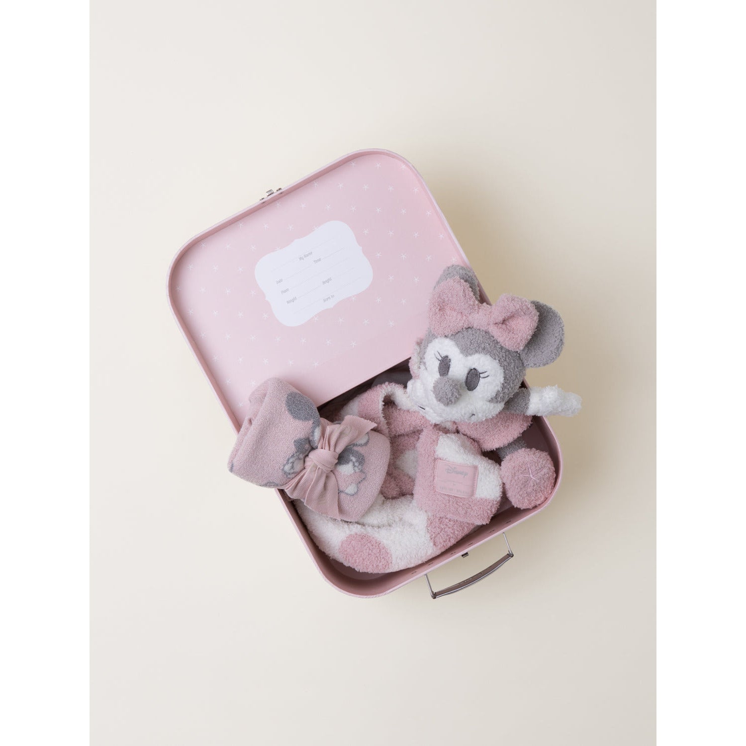 Snuggle up with fan favorite Disney Minnie Mouse™ in this adorable gift set. Set includes a CozyChic Ultra Lite tank top onesise with adjustable ruffle straps secured with back button, snap closures at bottom, Minnie jaquard design, and a CozyChic Minnie buddie holding on to a signature polka dot blankie. Packaged inside a special luggage box with metal clasp and handle that doubles as a keepsake that details important info: name, date, time, place, height, weight, and born to.