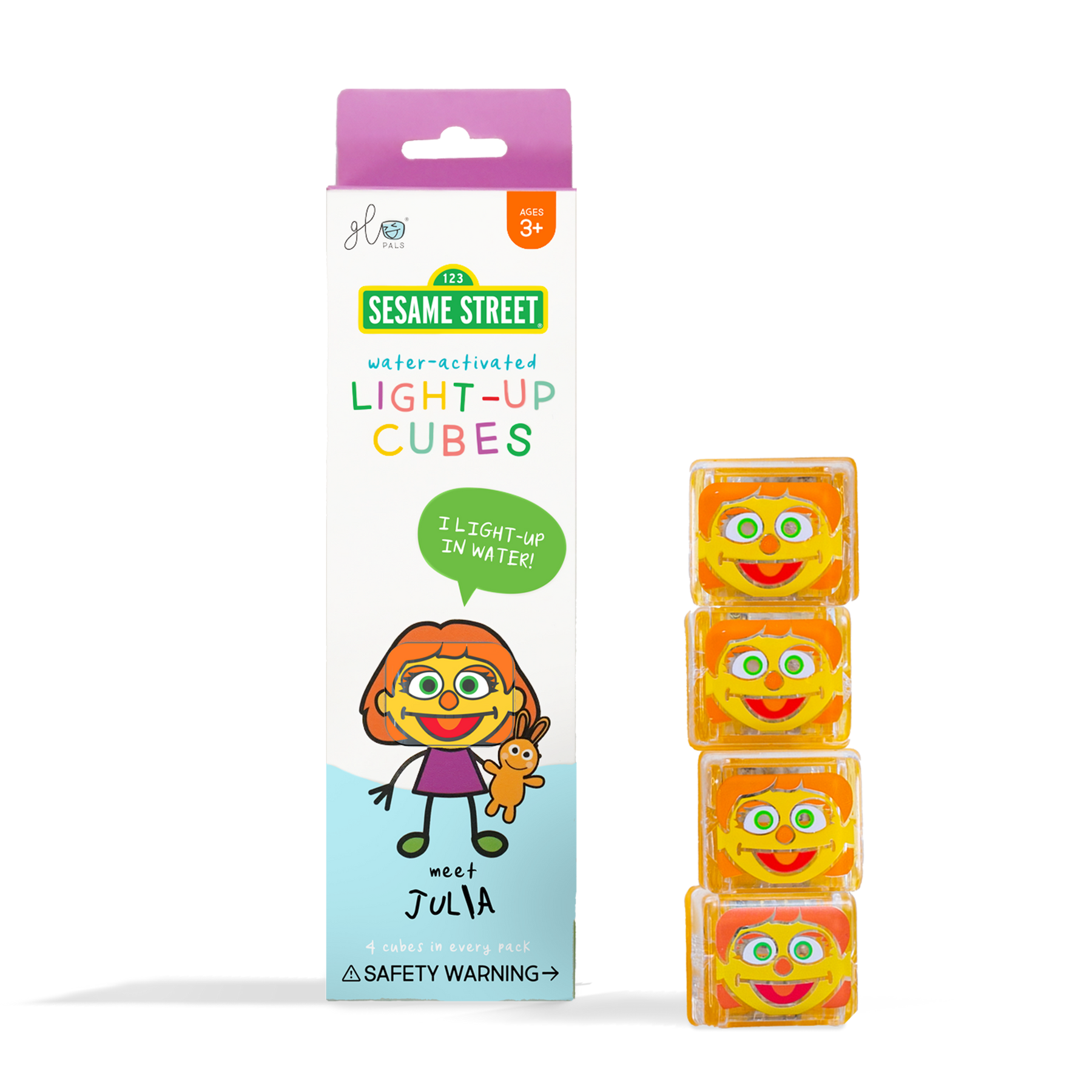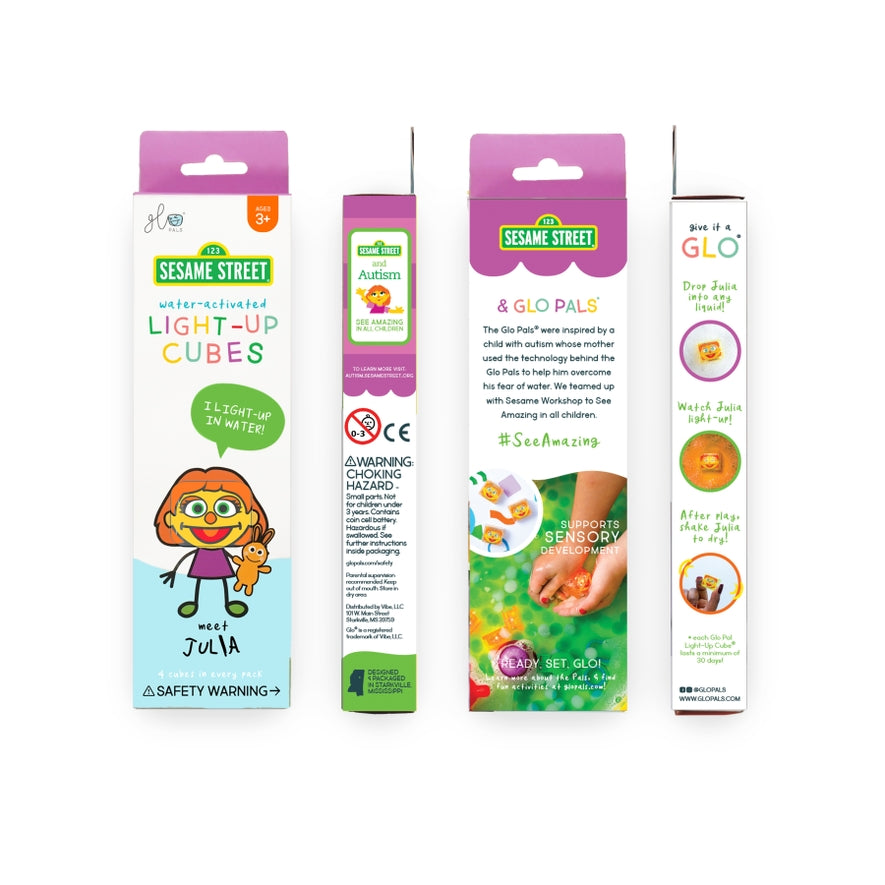 Meet Julia - Sesame Street’s first autistic muppet! We are bringing sunny days in a whole new way! Just drop in any liquid and watch them come to life. INCLUDES: 4 Glo Pals Light-Up Cubes AGES: 3 years old +