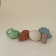 Make a splash at bathtime with the Mushie dino bath play set that includes three friendly dinosaurs and an egg with adorable baby dino nestled inside. Made from 100% food grade silicone, the soft material is easy for little hands to hold while wet or dry.