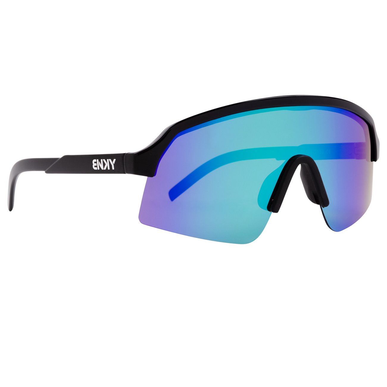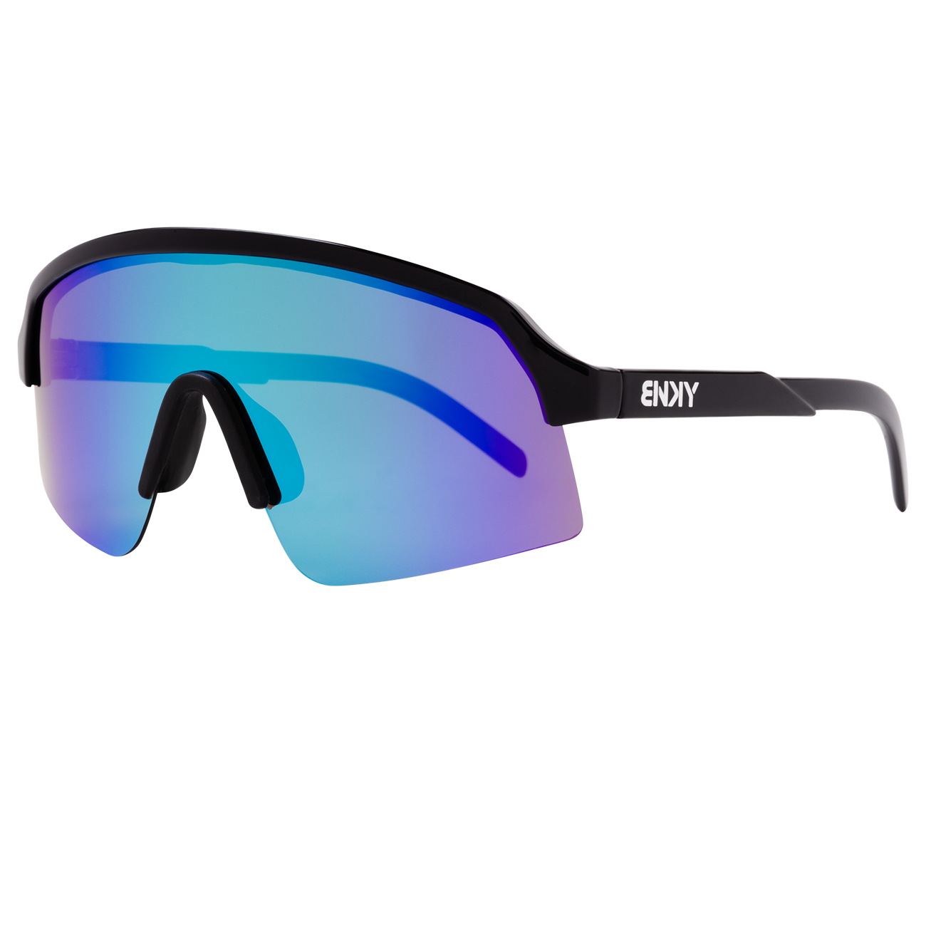Our Baja Saline Junior sunglasses have black rims with a blue/green colored reflective lens. Our BinkyBro BNKY signature logo is present on the temples of the sunglasses. Size fits best for kids in the 6 years - 10 years old.