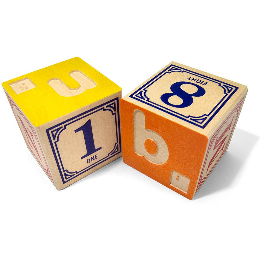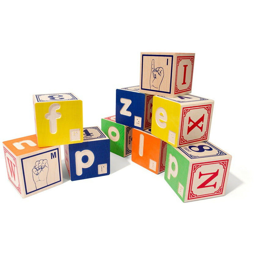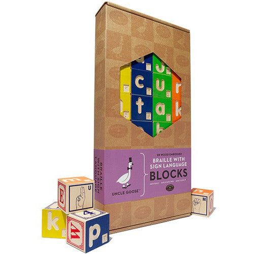 An educational toy for those who want to use American Sign Language to communicate. Touch the two debossed sides on every block of this 28 block set. Use your fingertips to trace the clean, European-style font that accompanies every letter.