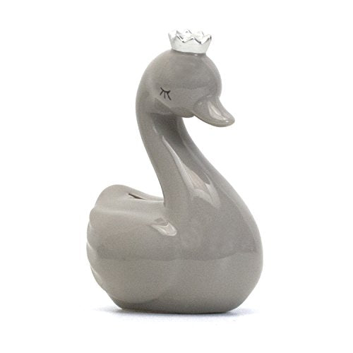 All of our banks are made from only the highest quality ceramic, known as dolomite, for increased durability. They feature a base that is deep glazed, insuring that this essential color doesn't wear off with repeated handling. To finish things off, we add a shiny finishing that keeps the colors of all of the underlying components locked in place, meaning that you never have to worry about compromising the quality of the bank with repeated use. This medium sized bank is a gray swan with a silver crown. It is the perfect size for your child's bedroom measuring at 5" x 4" x 7", they are just a little smaller than our large banks but still so cute! A shiny gray swan with a royal silver crown.