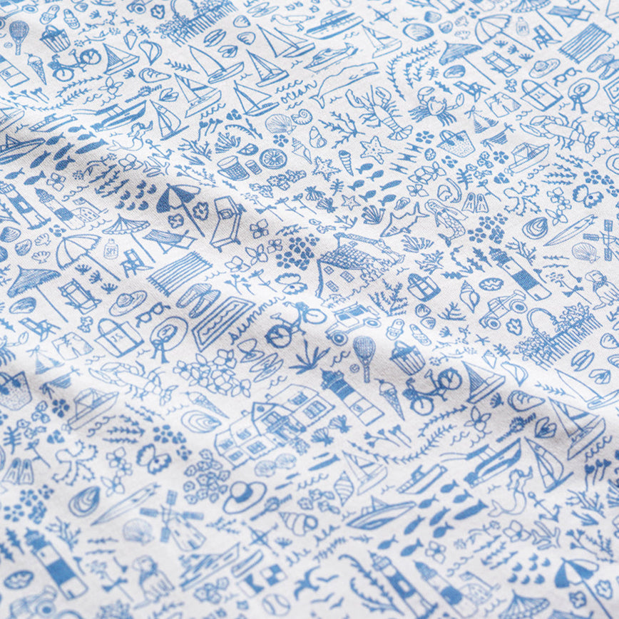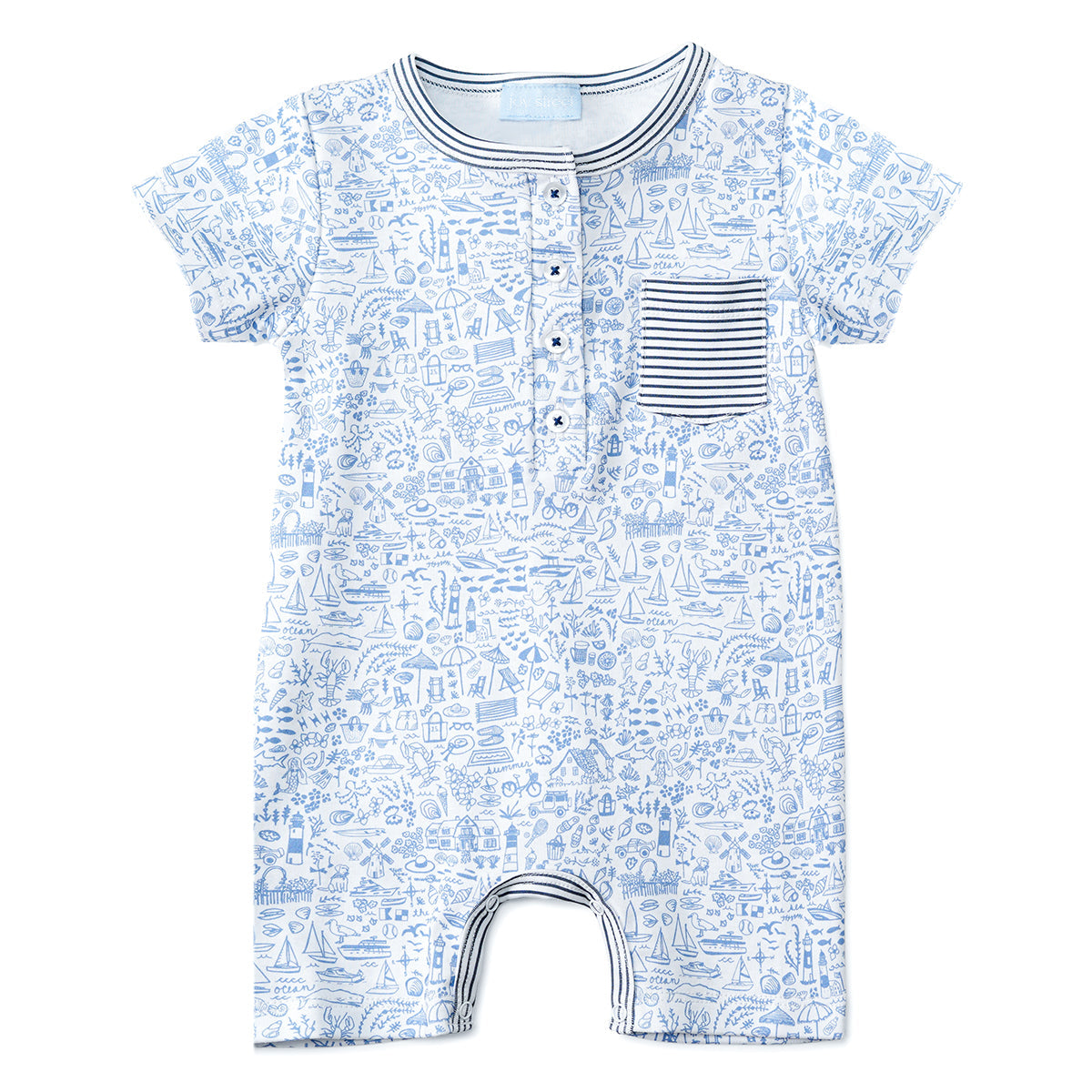 Enjoy sweet dreams of sunshine all year long with the help of our Seaside print in our Boy's Shortie Romper which features all of our favorite warmer weather traditions. Travel from the beach to your favorite clam shack to shuck some oysters and watch the sun set just beyond your favorite old light house. This print is sure to give you all of the summer time feels.