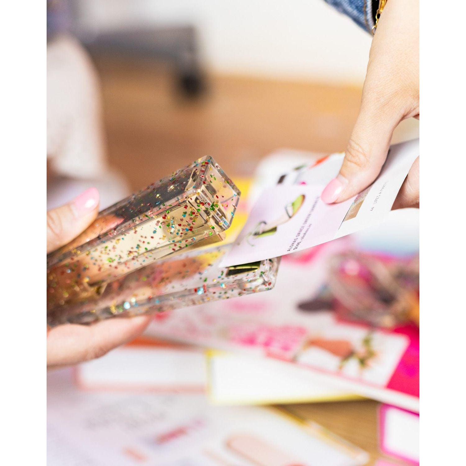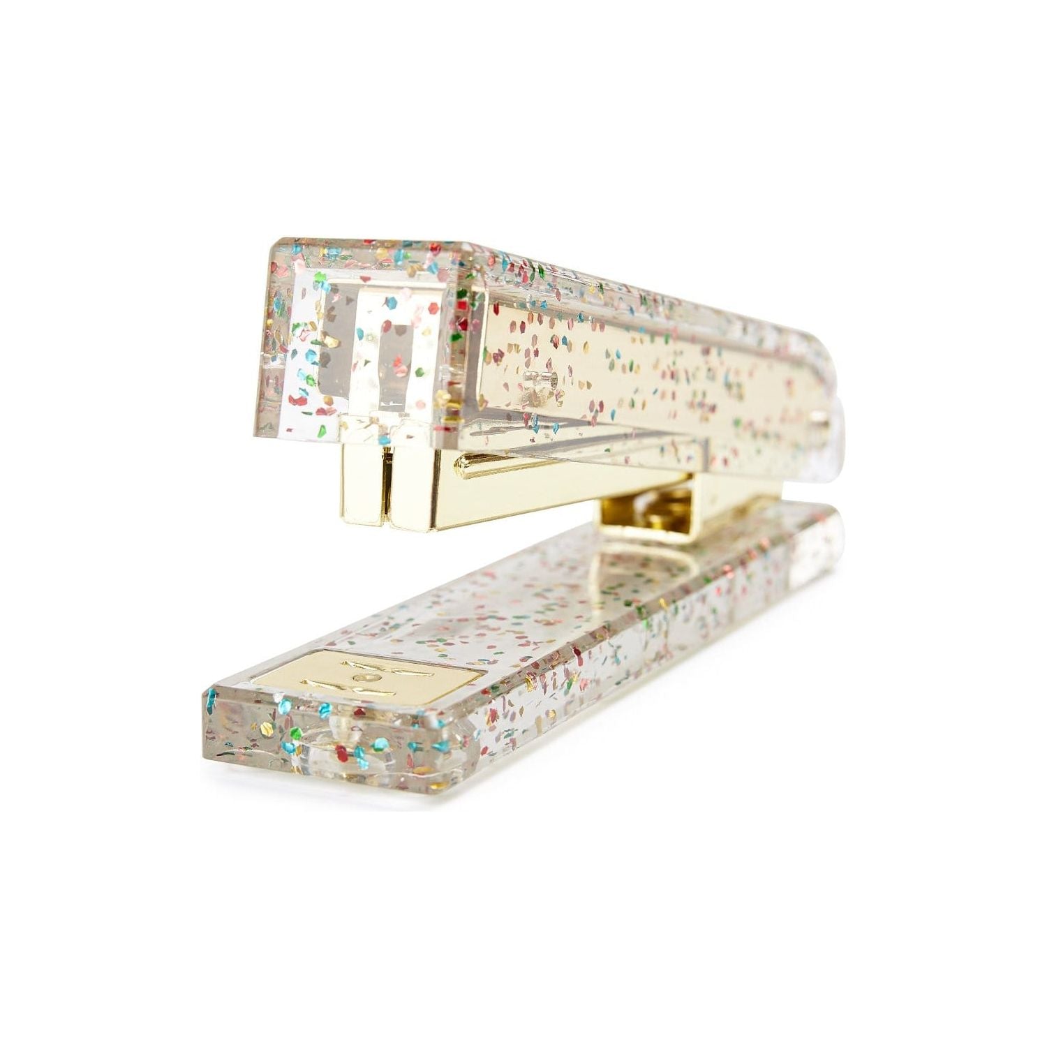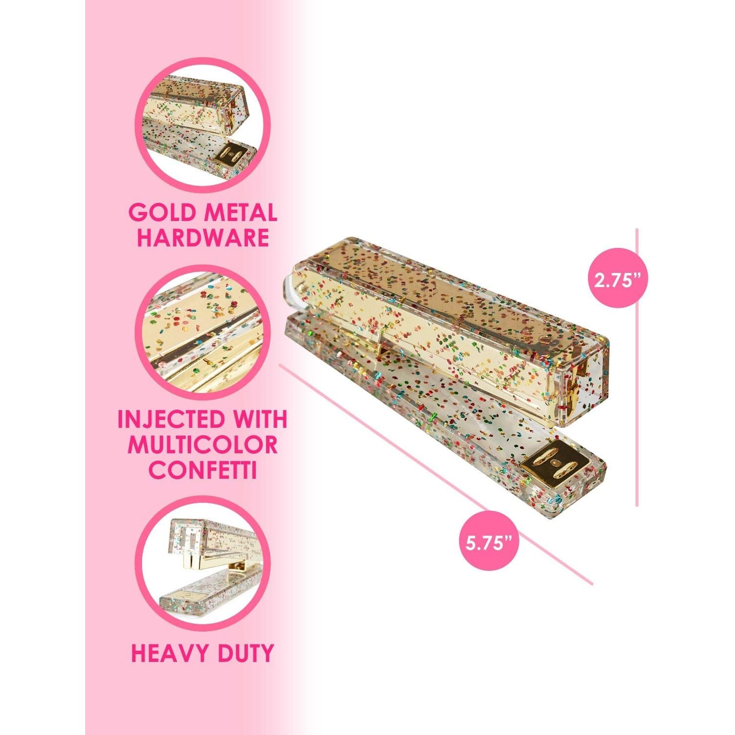 Bring the party to your desk with this confetti stapler! Designed to brighten up any desk, this cute stapler will bring a touch of fun to your daily tasks. Perfect for home, school, and office, this high-quality novelty stapler is not just cute but also functional; effortlessly security your documents. Don't blame us when you start looking for any excuse to staple!