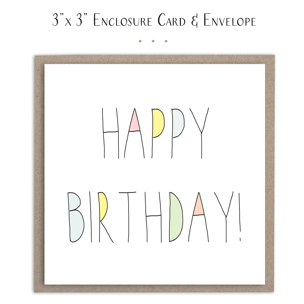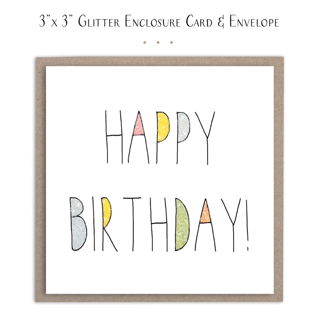 Birthday Card filled with colorful letters that simply spell out... Happy Birthday! (3x3" enclosure card) CHOOSE YOUR FINISH: plain or embellished with shimmery glitter on the pastel letters * 3x3” mini flat enclosure card * premium 80lb cover card stock * kraft envelope * available ‘plain’ or ‘embellished’ with glitter * room for a small handwritten note on reverse side * each card is packaged in a clear, sealed cello sleeve * handmade in USA ©susan case designs, llc - design by susan case