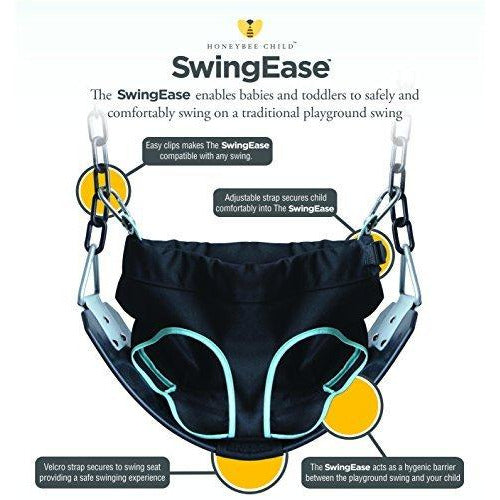 With the SwingEase, you are always ready for swing time fun at the playground! The HoneyBee Child SwingEase is a new patented product that enables babies and toddlers to safely and comfortably swing on a traditional playground swing. The SwingEase also allows a child to swing on a caregiver's lap while safely secured. The SwingEase connects directly to a standard chain swing, converting it to a toddler swing. It has a comfortable cloth seat that supports the child across the chest, back, and under arms. An adjustable strap provides perfect fit for children of various sizes. Safety clips attach the unit to a standard chain swing. Easy to carry in its own built-in bag, the SwingEase is small enough to carry along in a diaper bag, purse, or stroller. If the SwingEase gets dirty, just remove the safety clips and pop it in the wash.With the SwingEase your child can swing at any playground with standard chain swings and swing next to an older child who is able to use standard swings. You can also safely swing with your child in your lap. Fabric is 100% Nylon and BPA, Phthalate, and Lead Free. See www.honeybeechild.com/store/swingease for more product information. U.S. Patent No. 8,992,337.