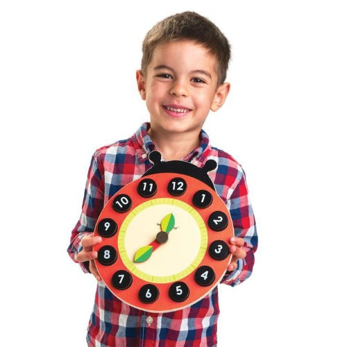 Teach your little ones numbers and time with our Ladybug Teaching clock! Includes 12 magnetized wooden number discs with the corresponding number of dots, and can be hung up on a wall with a small bracket on the reverse.
