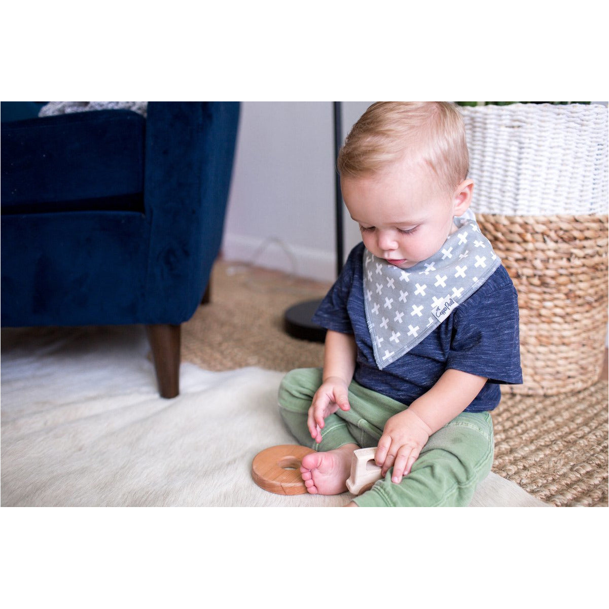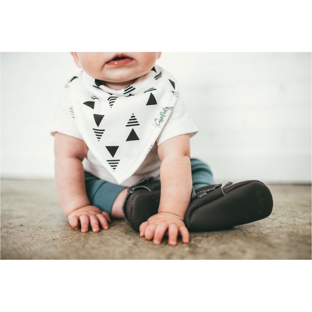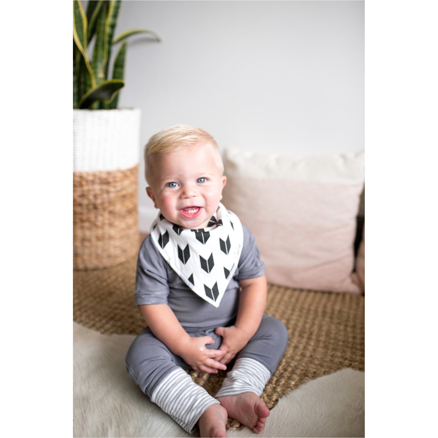 These stylish drool bibs are made of 100% absorbent cotton on the front and 100% polyester fleece on the back. The front of the baby bib is a stylish knit fabric and the back is a super soft fleece that keeps your baby completely dry even with the drooliest of babies. Great for teething babies!